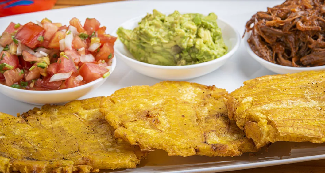 6 Patacones, frijoles molido, queso blanco, lechuga, pico de gallo, proteína a elegir, salsa de queso y salsa de la casa.