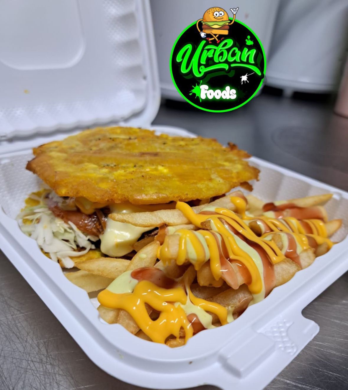 Hamburguesa de patacón con frijoles molidos, queso blanco, carne mechada, queso frito, salsa de queso, elige tu ensalada y salsa de la casa.