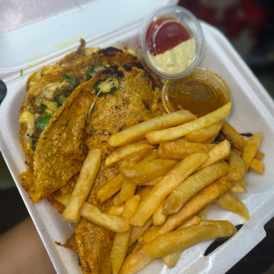 Tortilla de maíz con frijoles molidos, queso blanco, proteína a elegir, Lechuga, pico de gallo, natilla, salsa de queso, salsa de la casa. Acompañado de doraditas fritas y papas fritas con salsas de la casa.