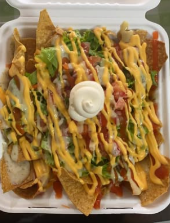 Tortillas de maíz frita relleno de proteína a elegir, frijoles molidos, queso blanco, lechuga, pico de gallo, salsa de queso y salsa de la casa.