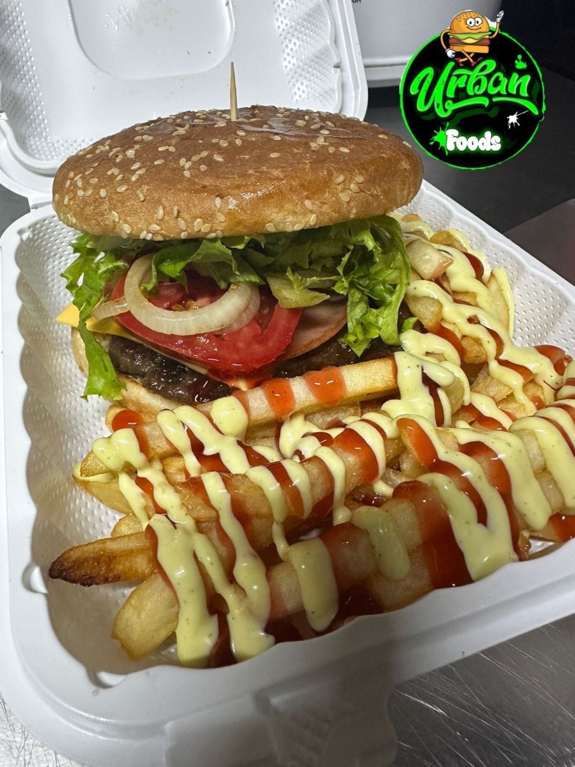Hamburguesa grande con papas fritas, doble torta cuarto de libra, jamón, queso, lechuga, tomate. cebolla y salsas de la casa.
