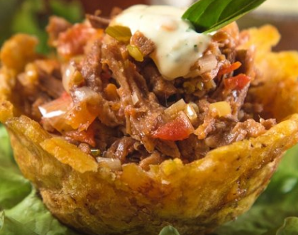 Patacón gigante en canasta con frijoles molidos, lechuga, pico de gallo, salsa de queso y salsa de la casa.