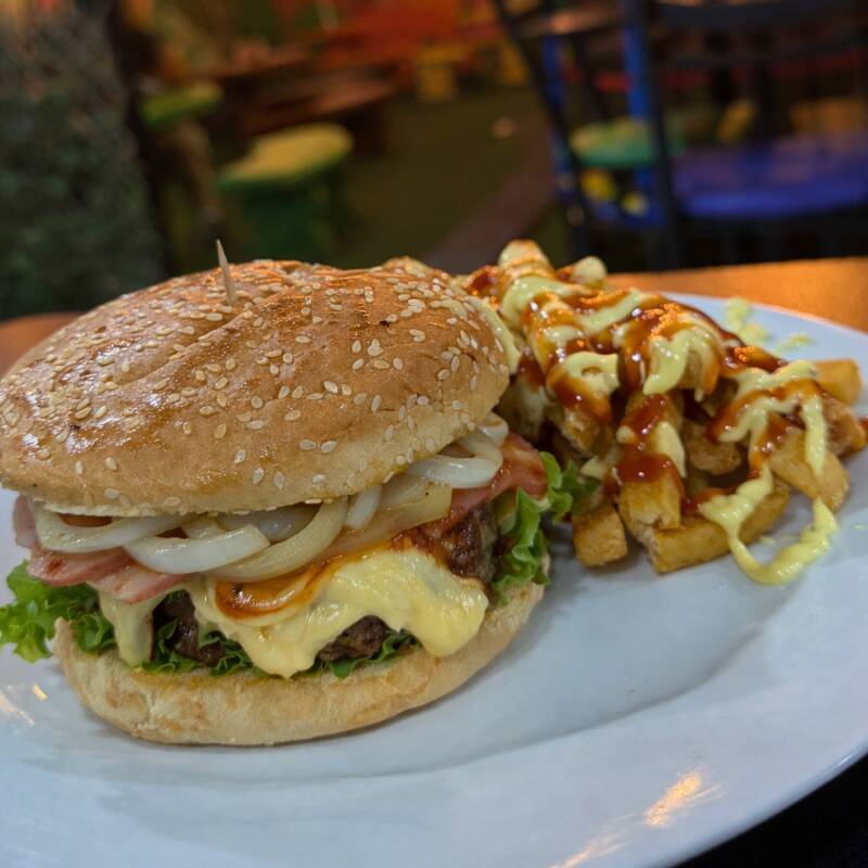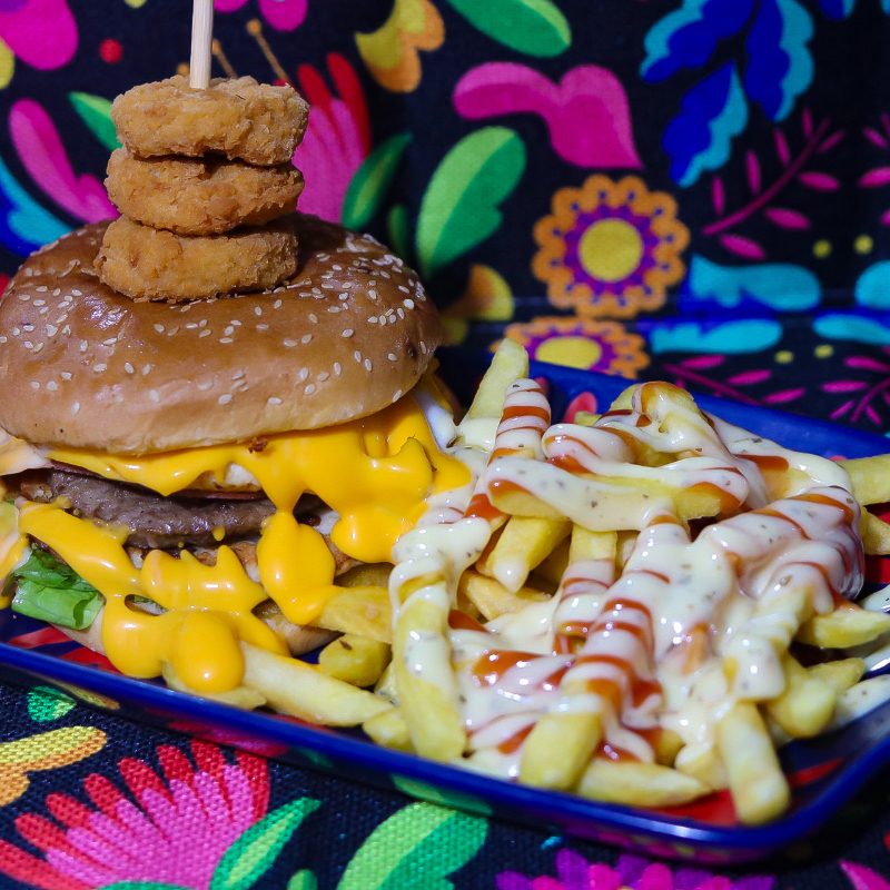 Enorme hamburguesa rellena de jamón, tocineta, 1/4 de libra de torta de carne de res, fajitas de pollo, huevo frito, mayonesa artesanal y queso cheddar derretido, acompañado de papas fritas.