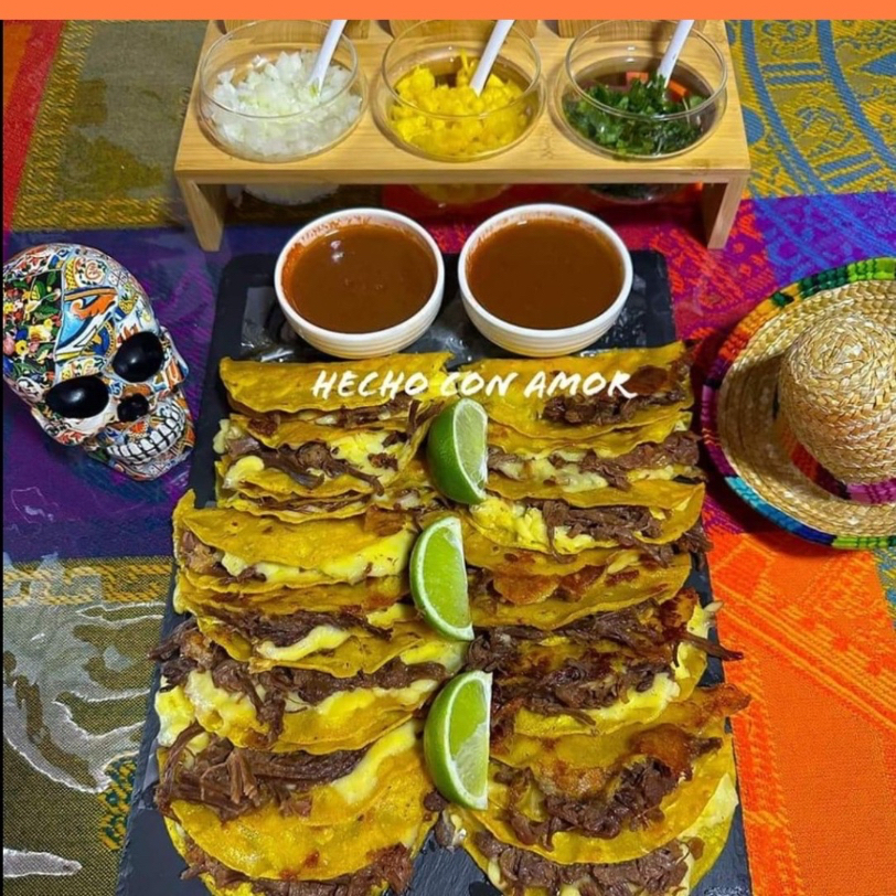 16 Tortillas de maíz doraditas por fuera y suaves por dentro, acompañadas de la perfecta combinación de carne de res, queso fundido, cebolla, culantro y su respectivo caldito de birria.