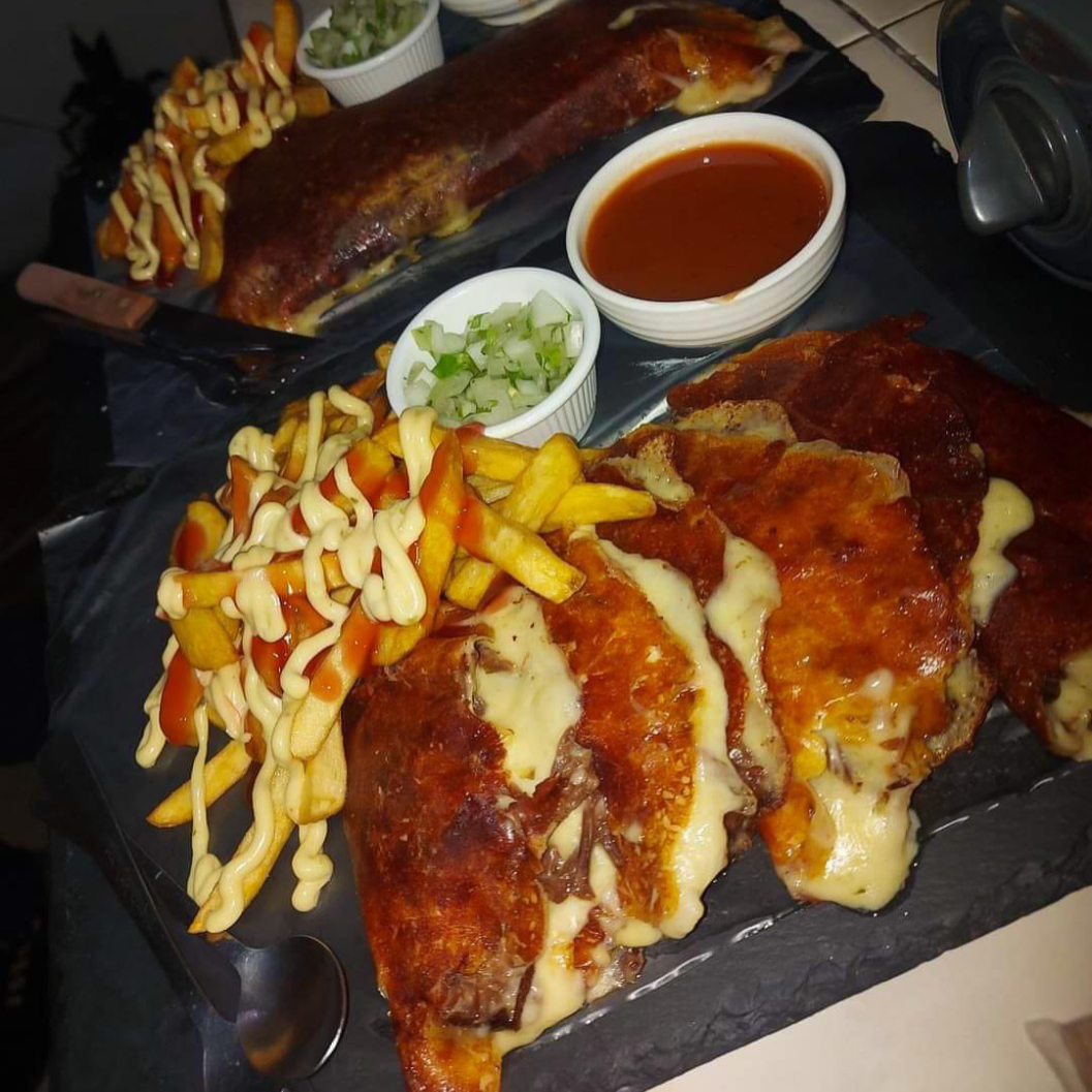 Deliciosa tortilla XL de harina, rellena de frijoles molidos, queso derretido, carne de res con queso cheddar y su respectivo caldito de birria. Con papas fritas bañadas en mayonesa artesanal, salsa de tomate y queso cheddar.