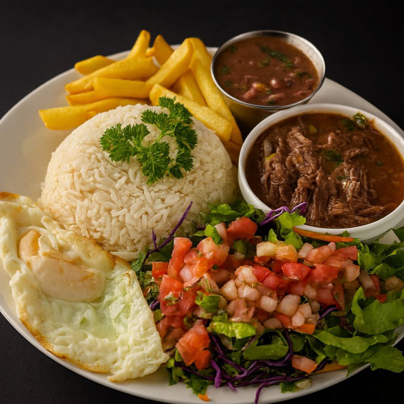 Arroz, frijoles, huevo frito, ensalada fresca y papas fritas, acompañado con la proteína a tu elección