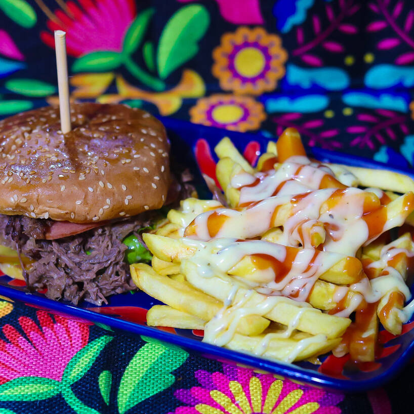 Deliciosa hamburguesa con carne mechada de res, jamón, queso amarillo, mayonesa artesanal, papas tostadas, lechuga y tomate. Pan 100% artesanal.