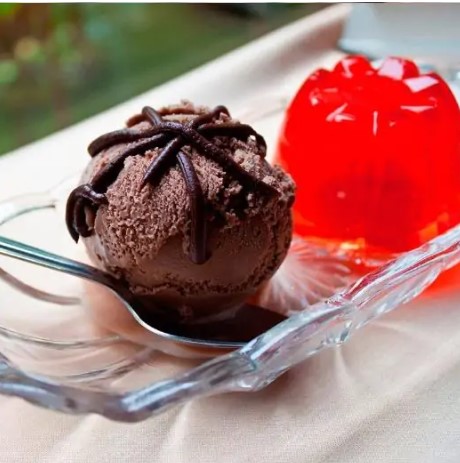 Con dos bolitas de helado, crema chantilly, arroz tostado con chocolate y chispas de colores.