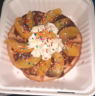 Waffle con Nutella, melocotón, crema chantilly y confeti de colores.