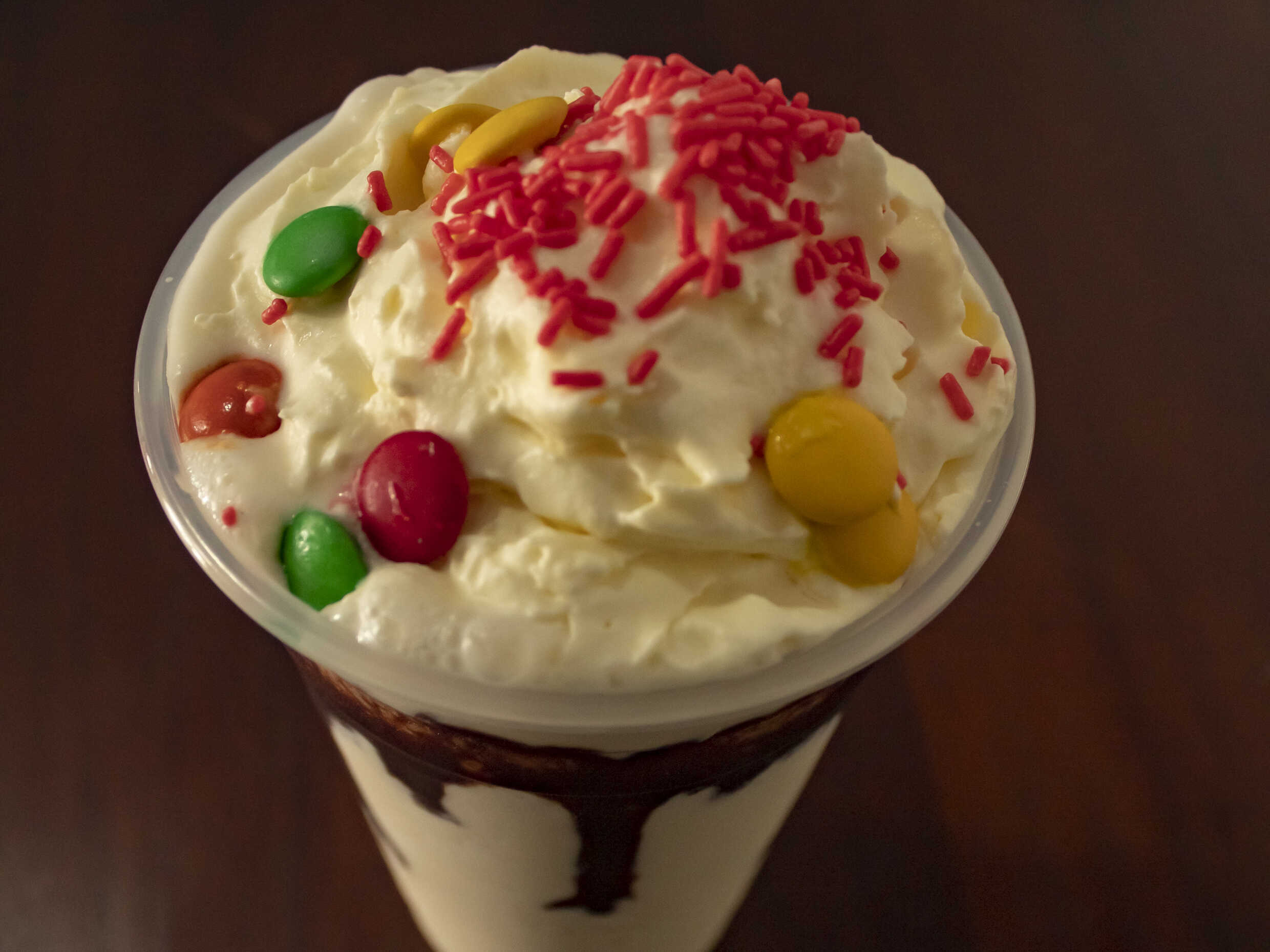 Grande de 20 onzas. Batido a base de helado con leche Pinito liquida. Chantilly y botonetas.
