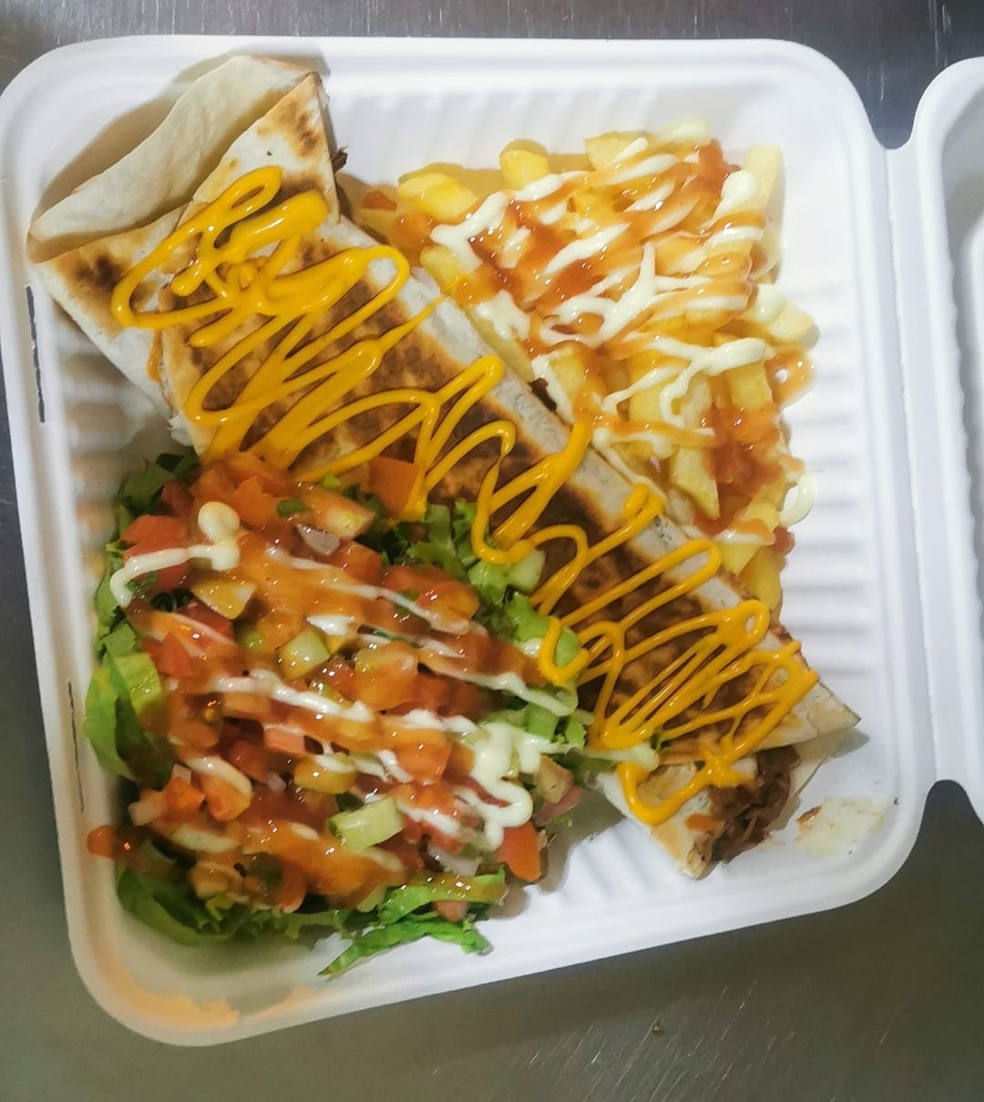 Tortilla de harina con pollo o carne o mixtos, con queso blanco y frijoles molidos, con papas a la Francesa bañados con ensalada de lechuga, kétchup, mayonesa y salsa de queso amarillo. Frito o a la Plancha?