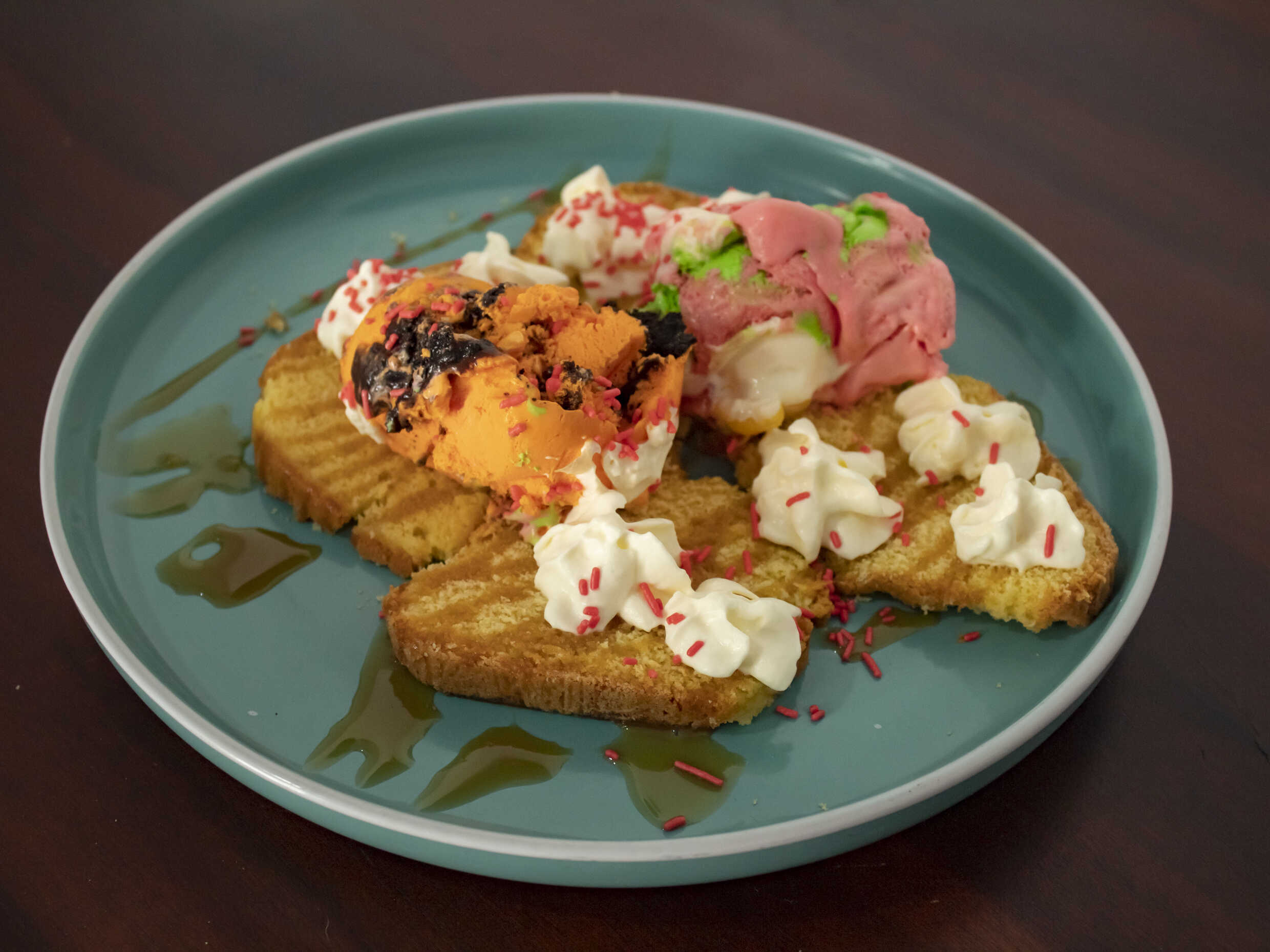 Dos bolitas de helado, gomitas de ositos, arroz tostado, chantilly y leche condesada.