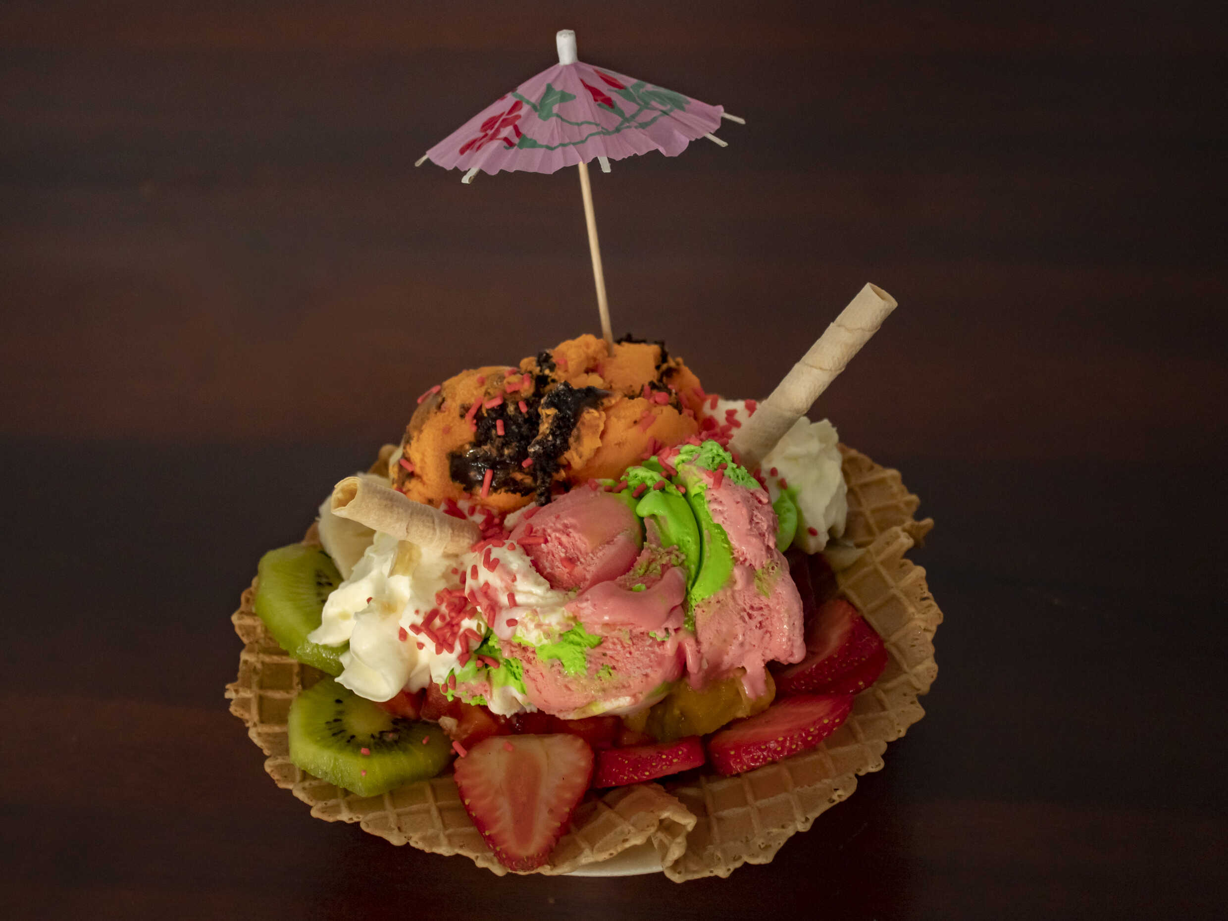 Banano, leche condensada, tres bolas de helado, barquillos, confitillo y chantilly.