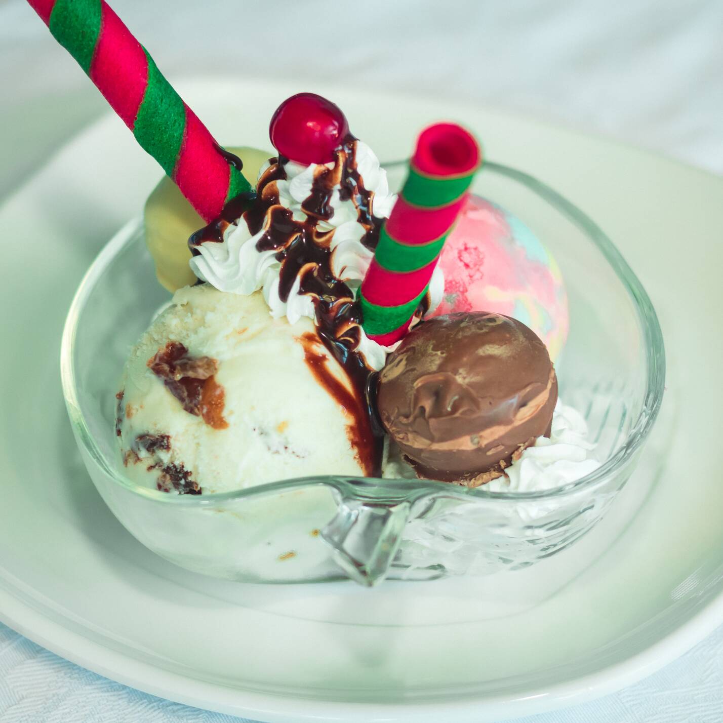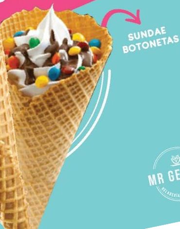 1 Helado al gusto, botonetas, barquillos, cereza, chispitas y chantilly.