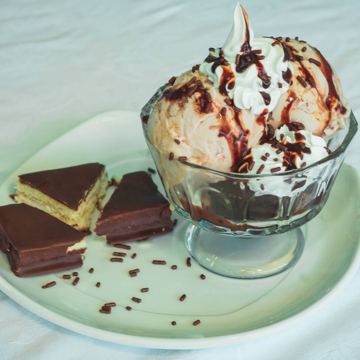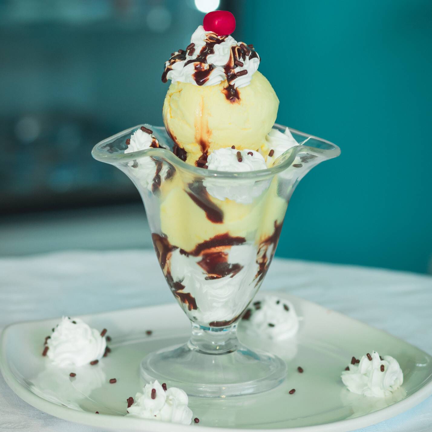 1 Helado al gusto, crema chantilly, topping de caramelo, chispitas de chocolate y cereza.