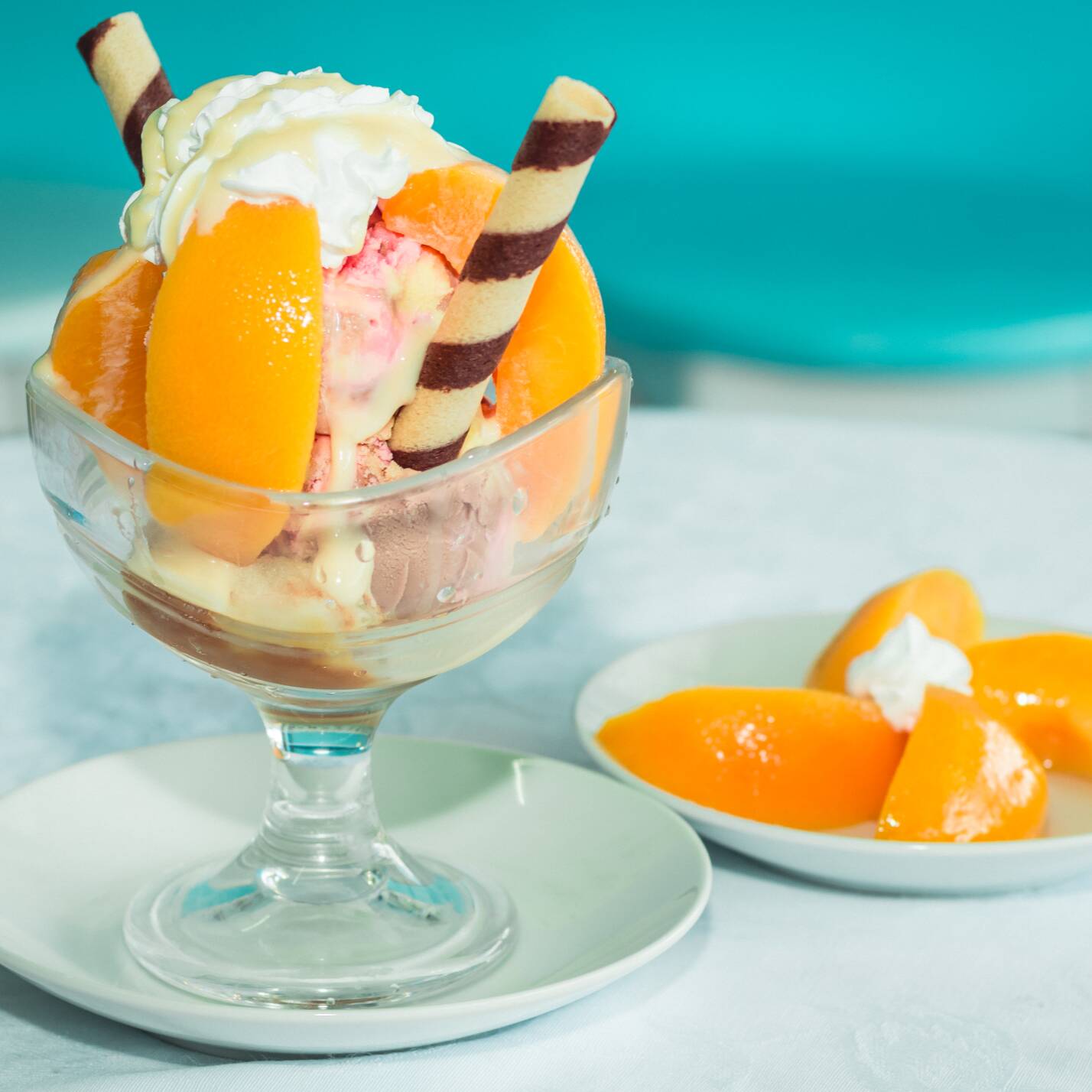 Queque merendina, 1 sabor de helado a elegir, melocotón, barquillos, chantilly y topping de leche condensada.