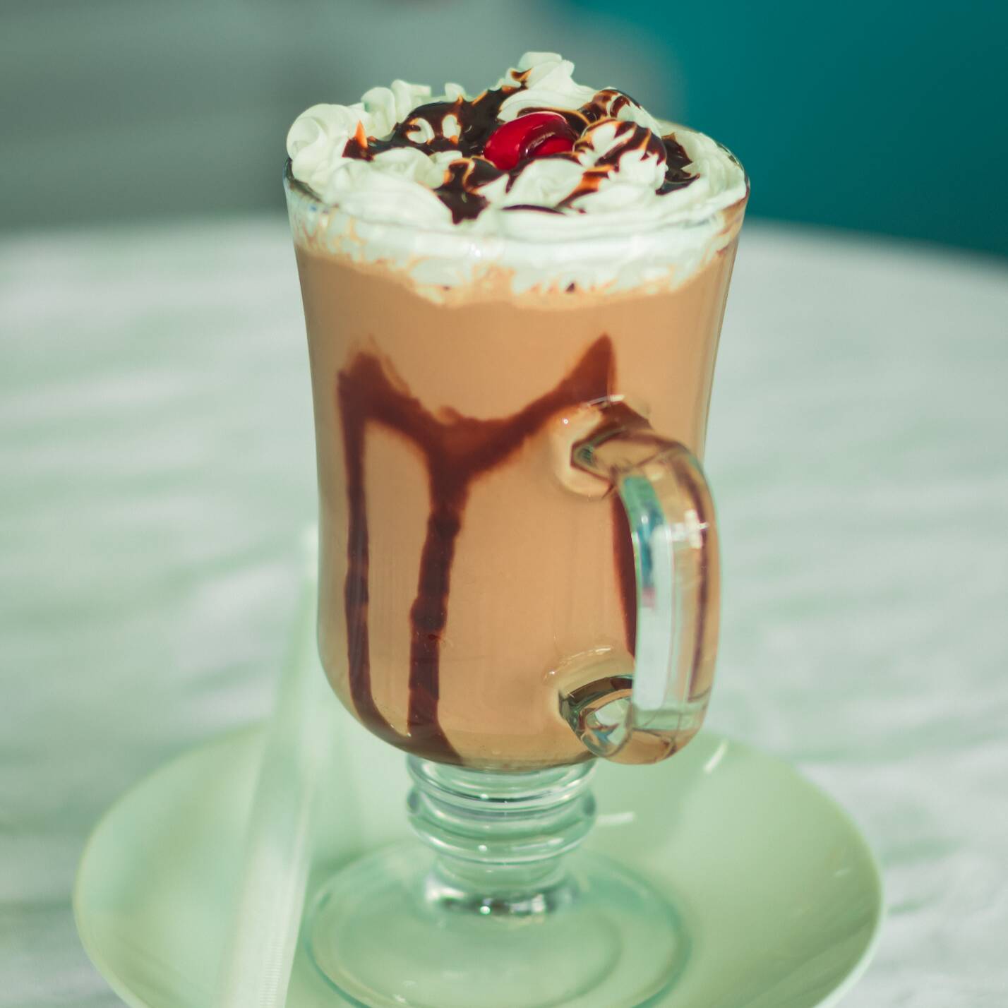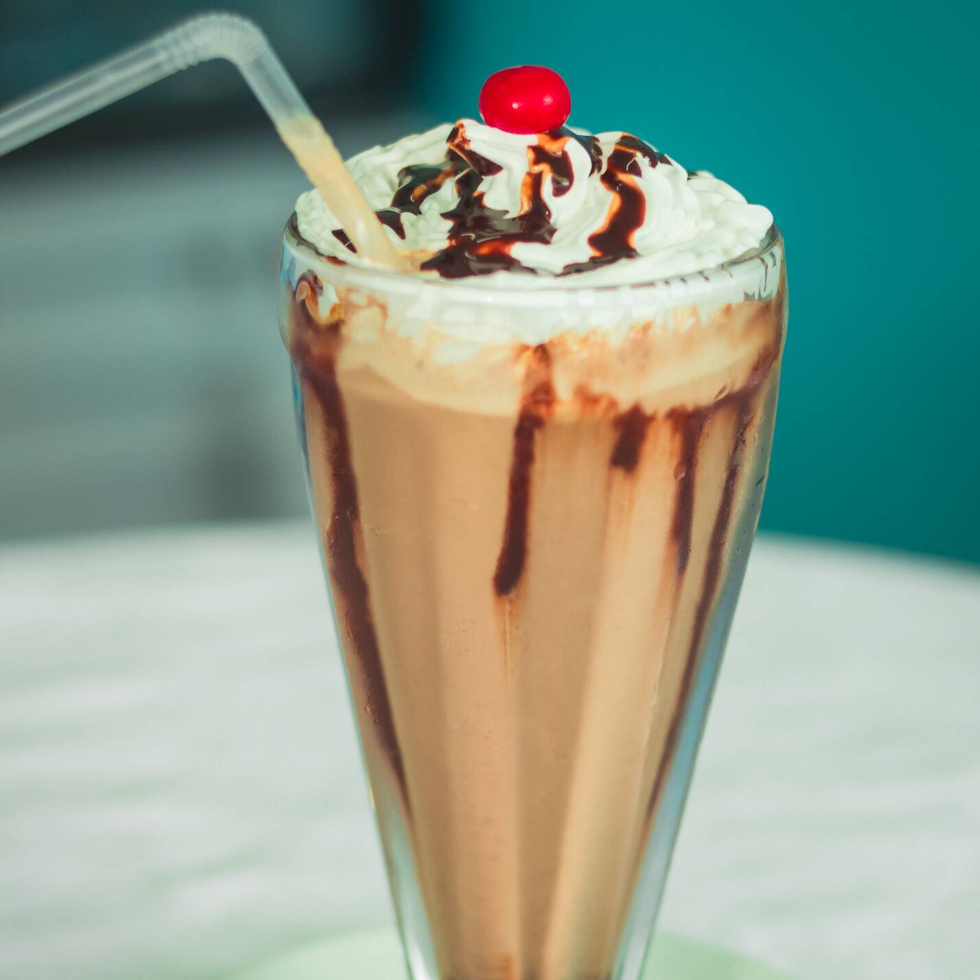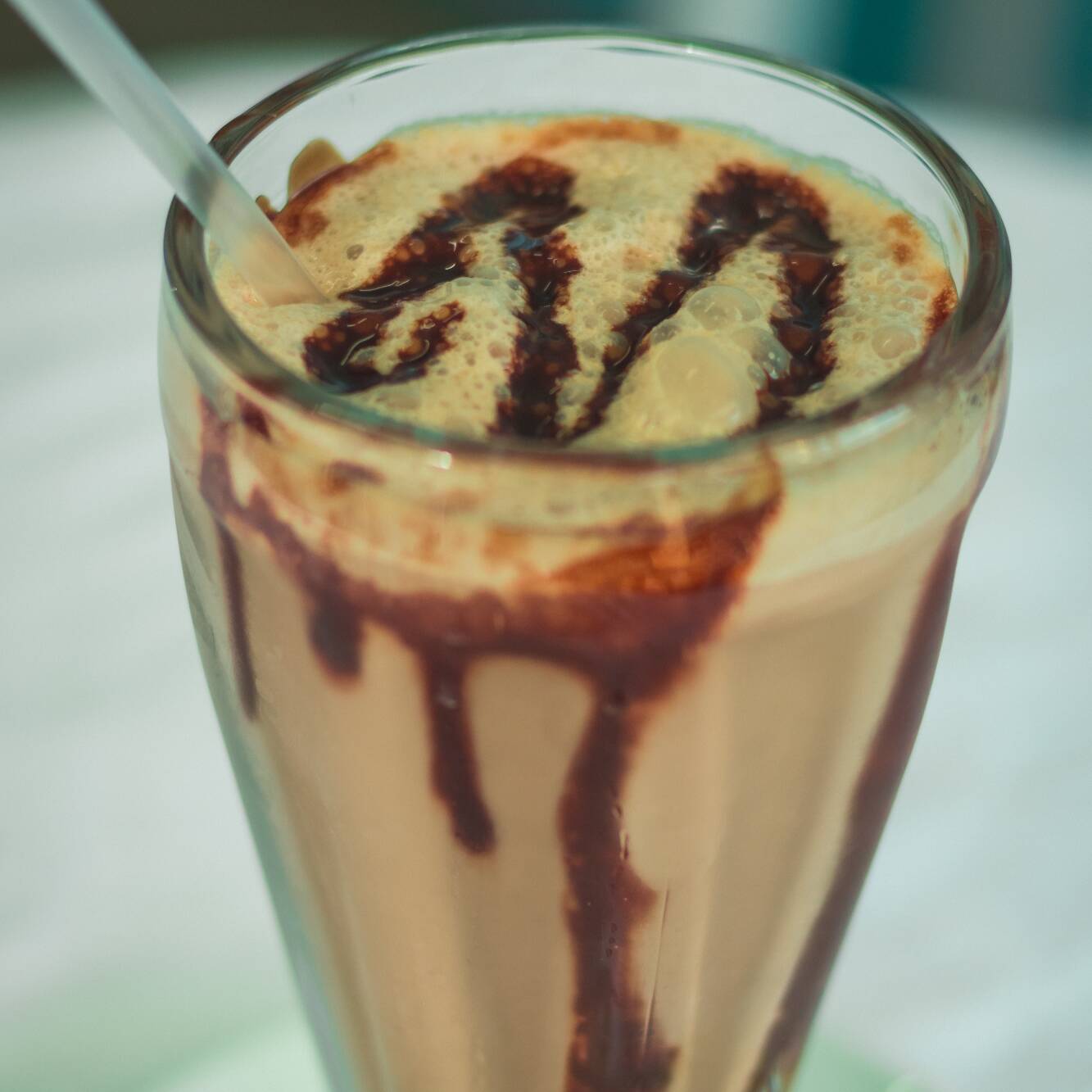 Helado de vainilla, leche, crema chantilly y topping de chocolate.