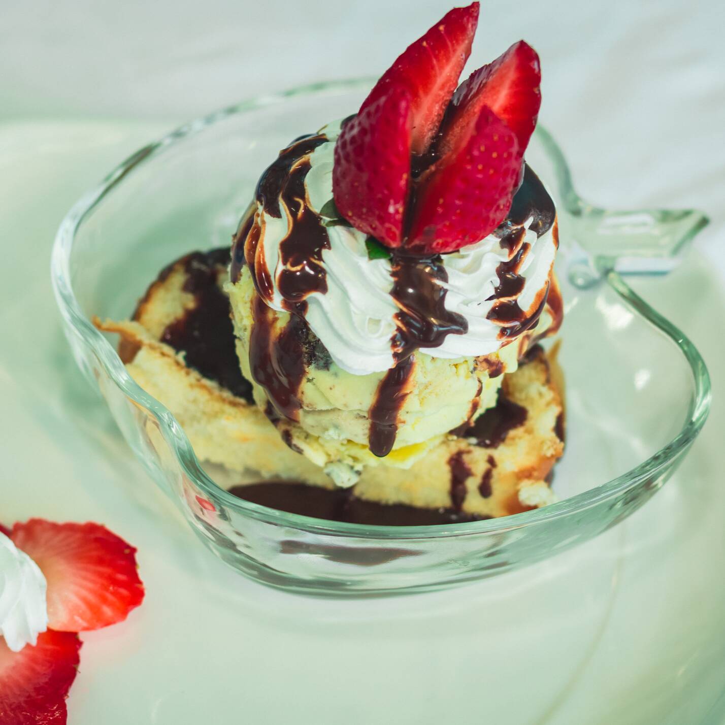 2 Sabores de helado, fresas naturales, barquillos, topping al gusto y chantilly.