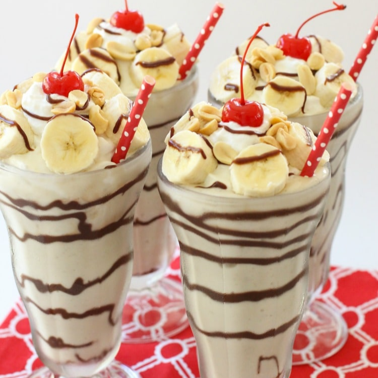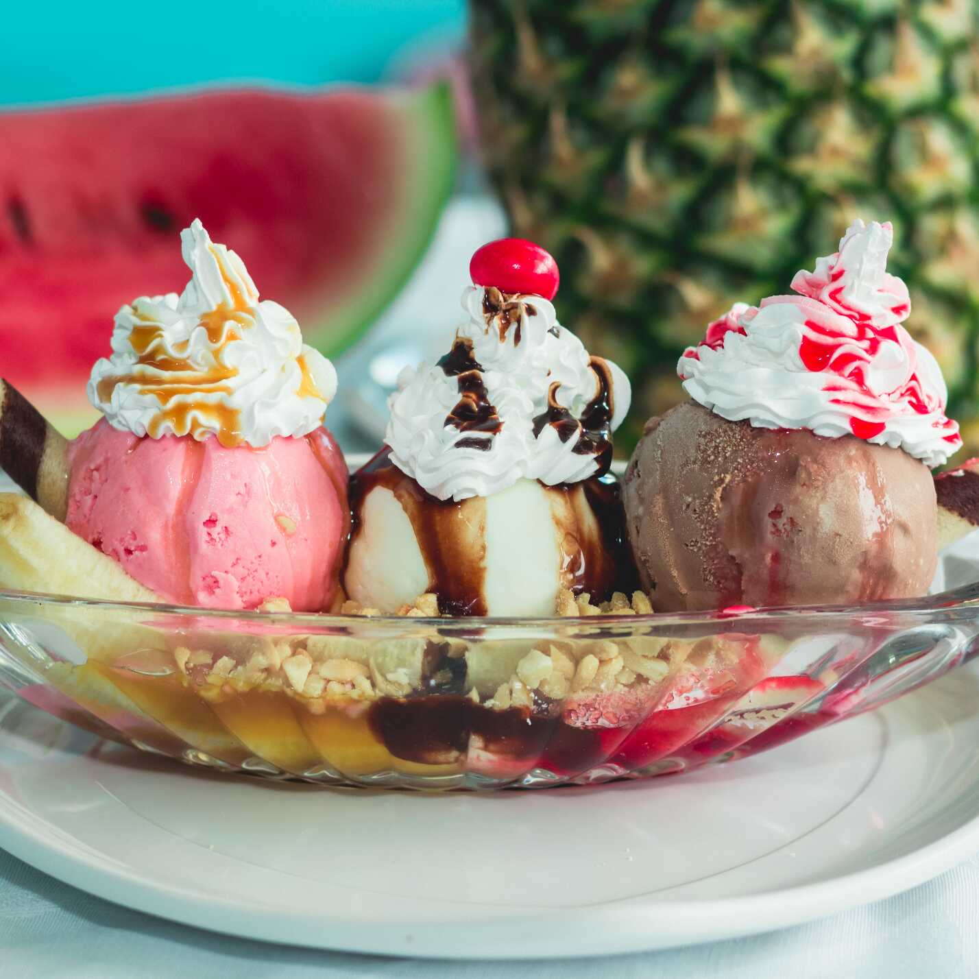 1 Banana, 3 sabores de helado a elegir, chantilly, barquillos, maní, topping de fresa, caramelo y chocolate.