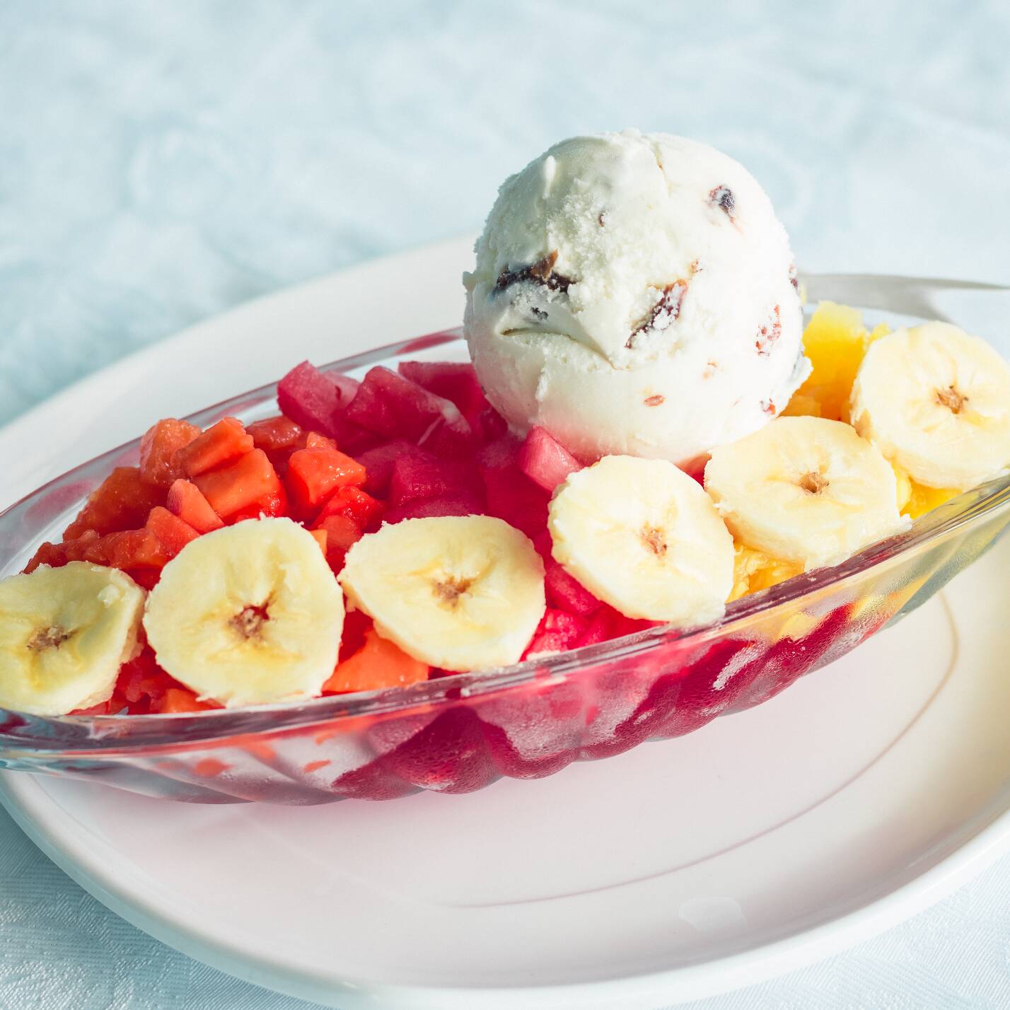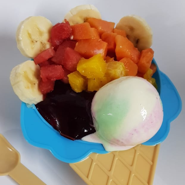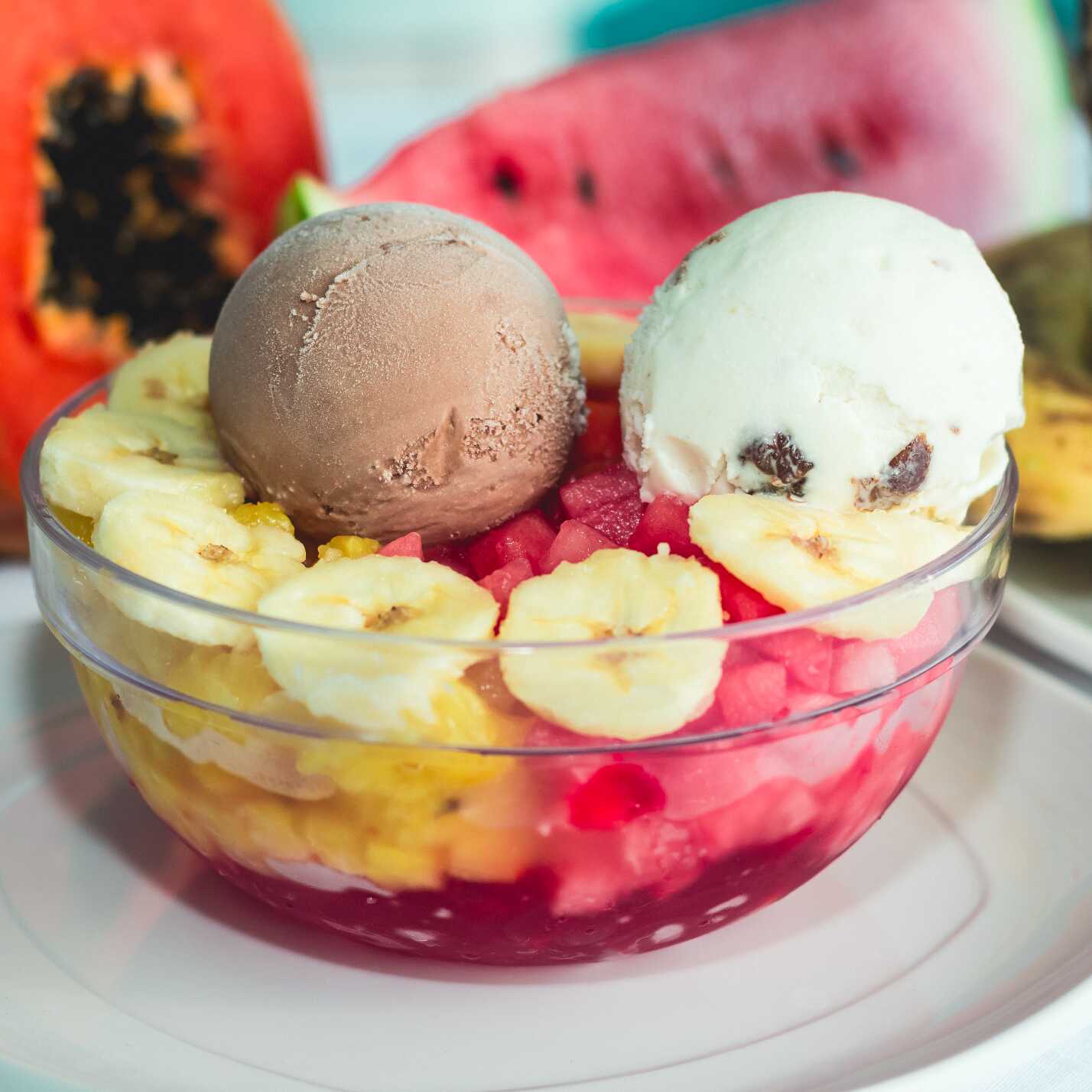 2 Ensaladas de frutas para adultos: la ensalada grande con 2 sabores de helado a elegir y una ensalada pequeña con 1 sabor de helado a elegir