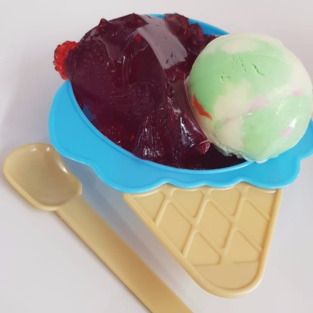 Gelatina, 1 helado a elegir, banano, papaya y piña.