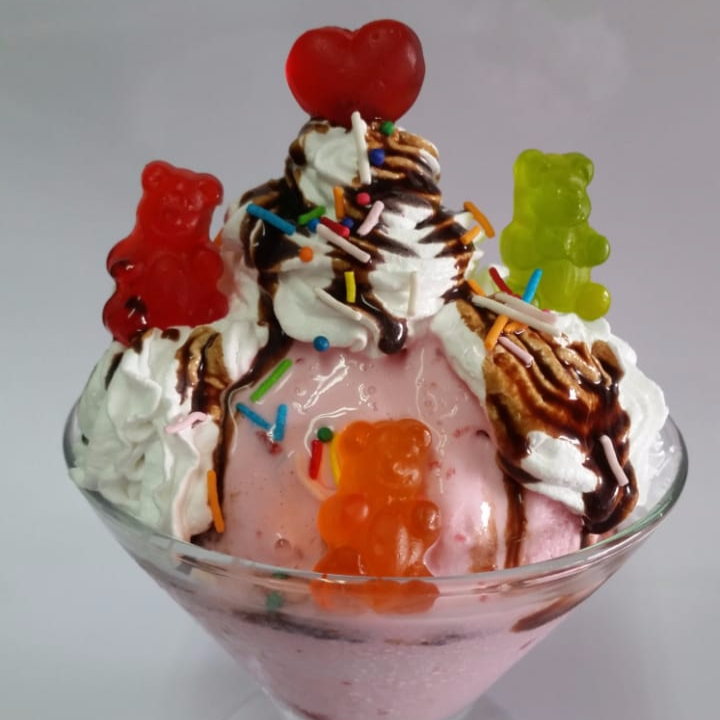 1 Helado al gusto, chantilly, topping al gusto, chispitas, gomitas de osos y corazoncitos.