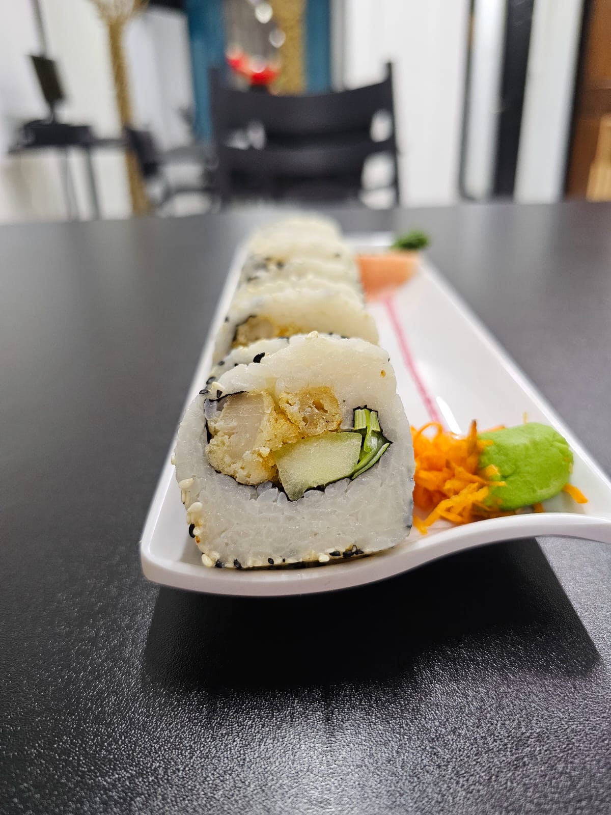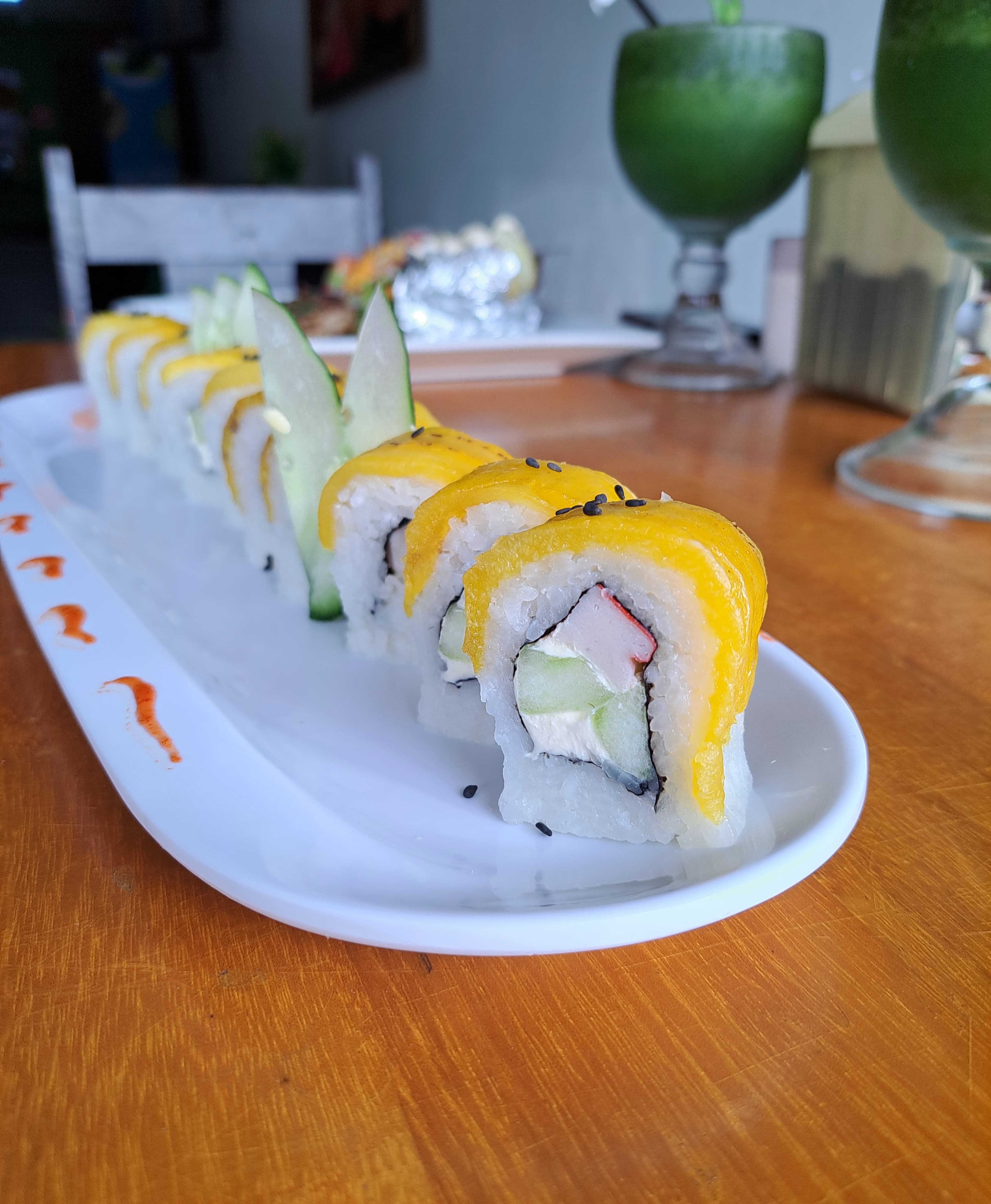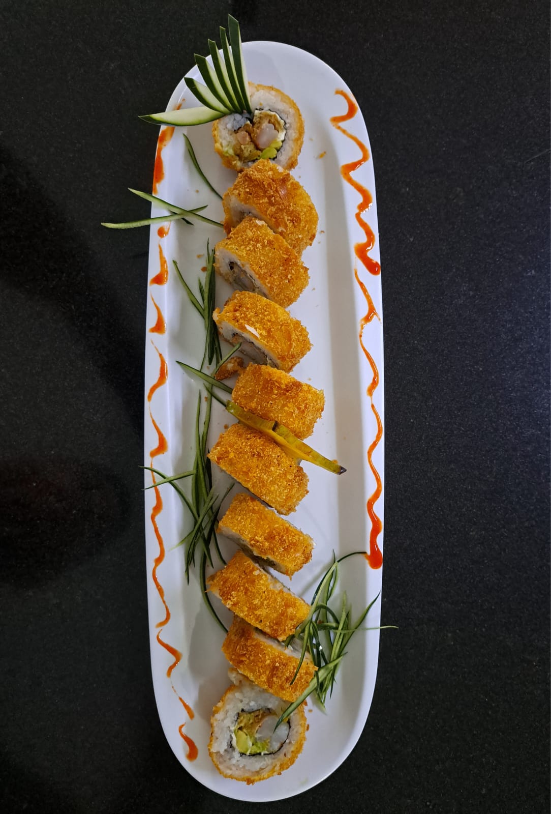 Delicioso sushi relleno de pescado tempura, cebollino, pepino, cubierto de ajonjolí y salsa de anguila.