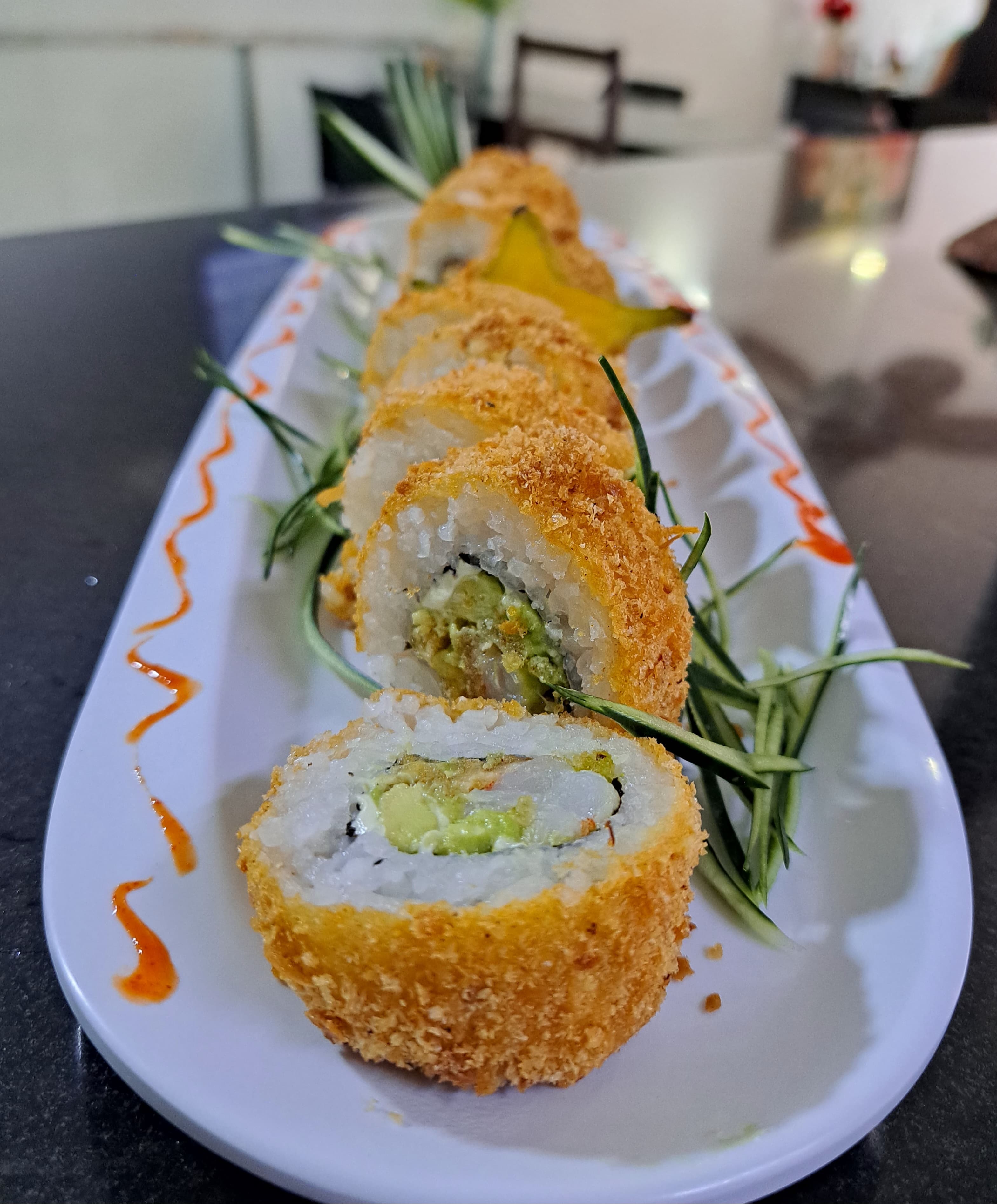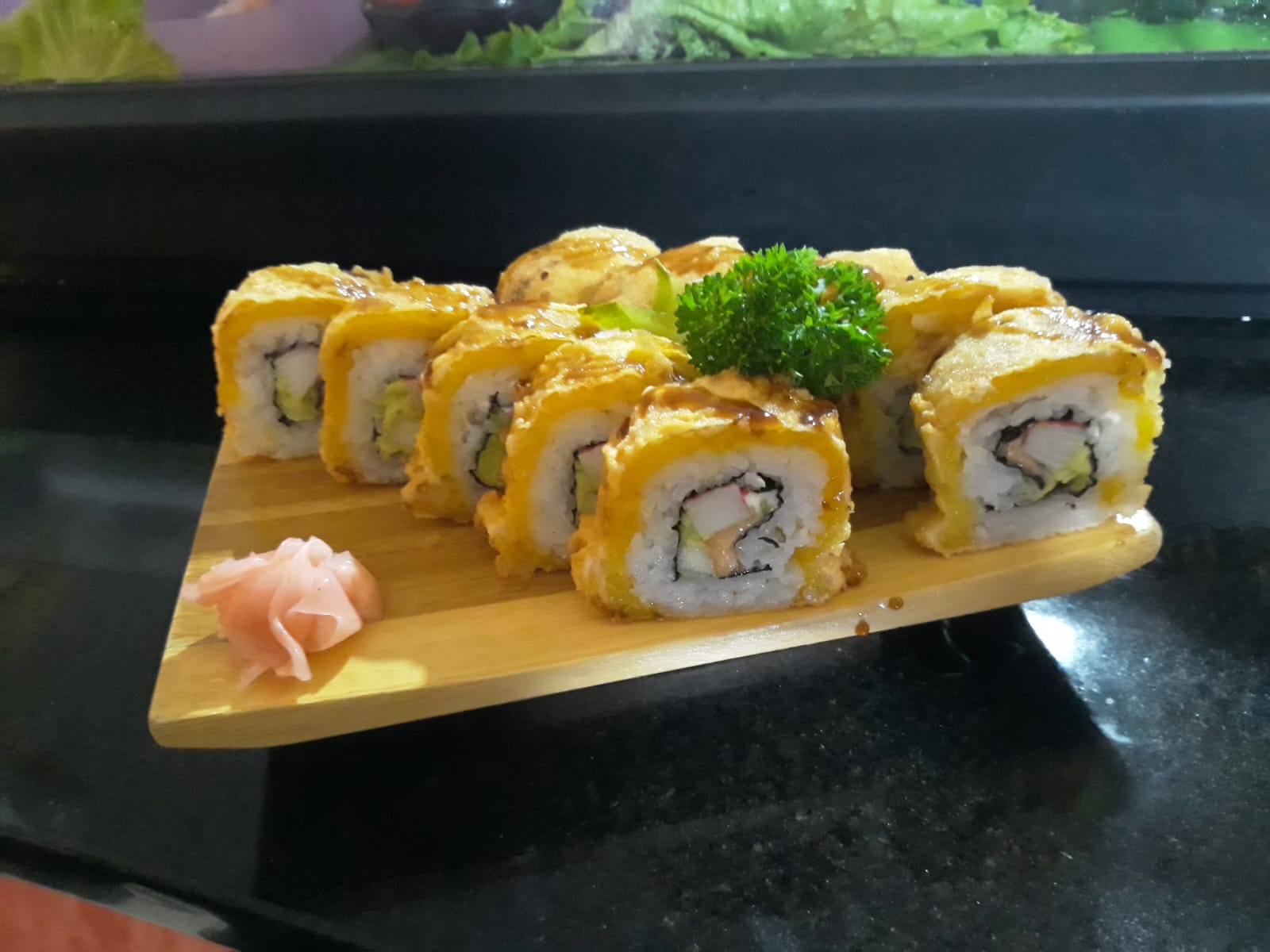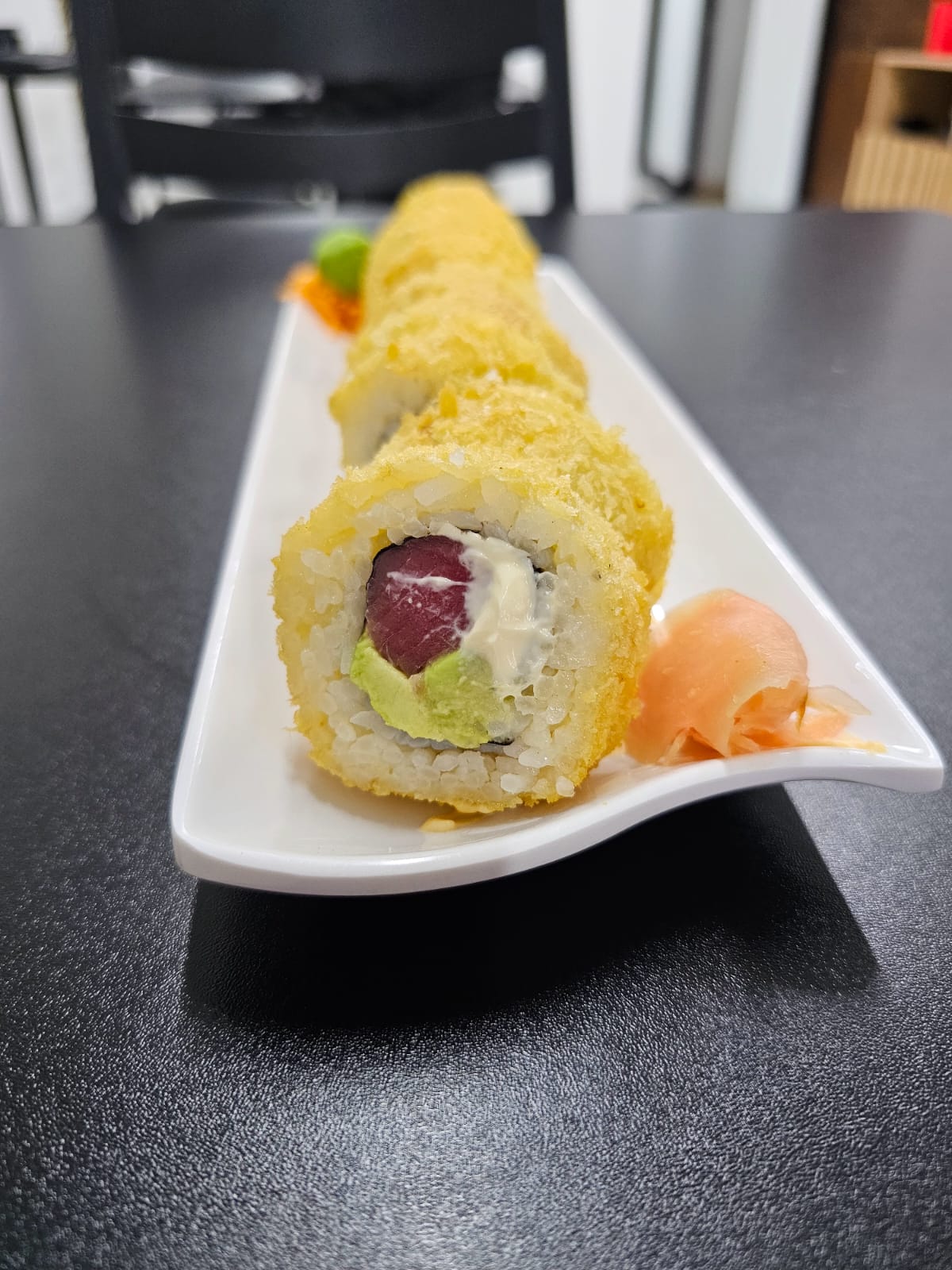 Delicioso sushi relleno de surimi, plátano maduro, queso crema, cubierto en pasta tempura y salsa anguila.