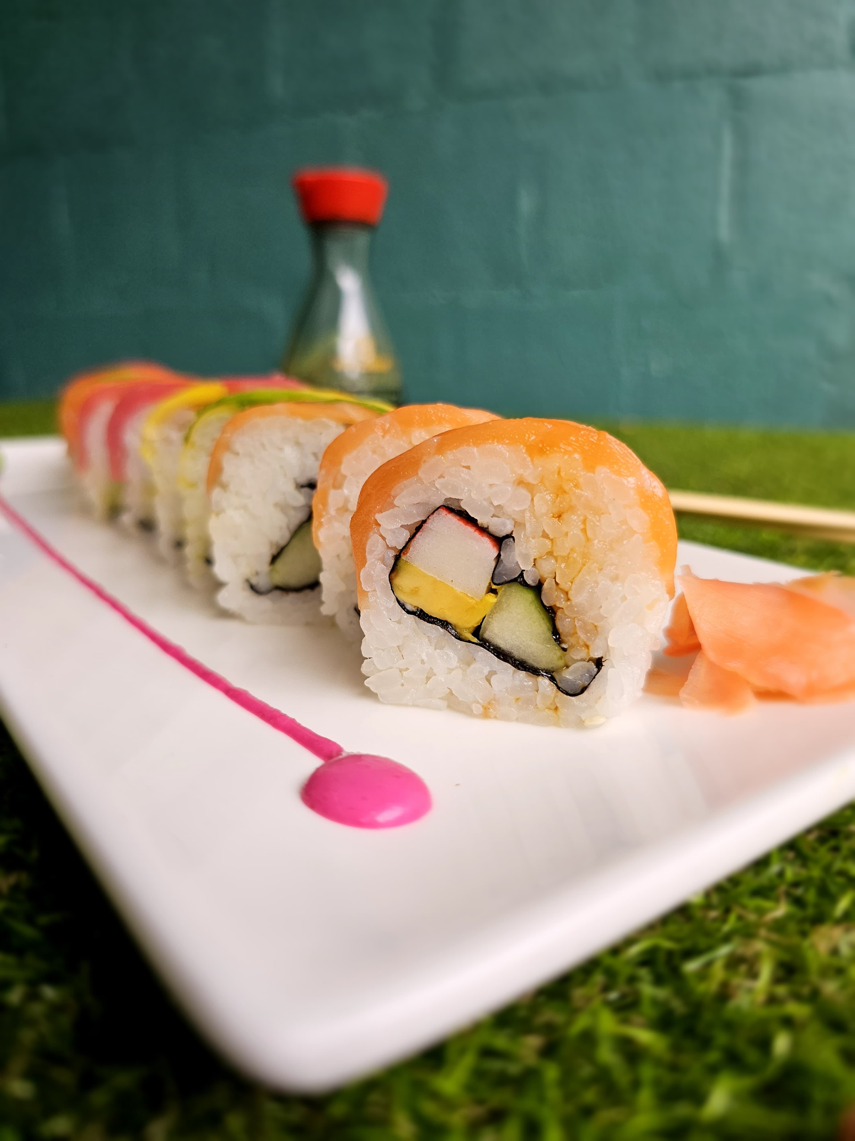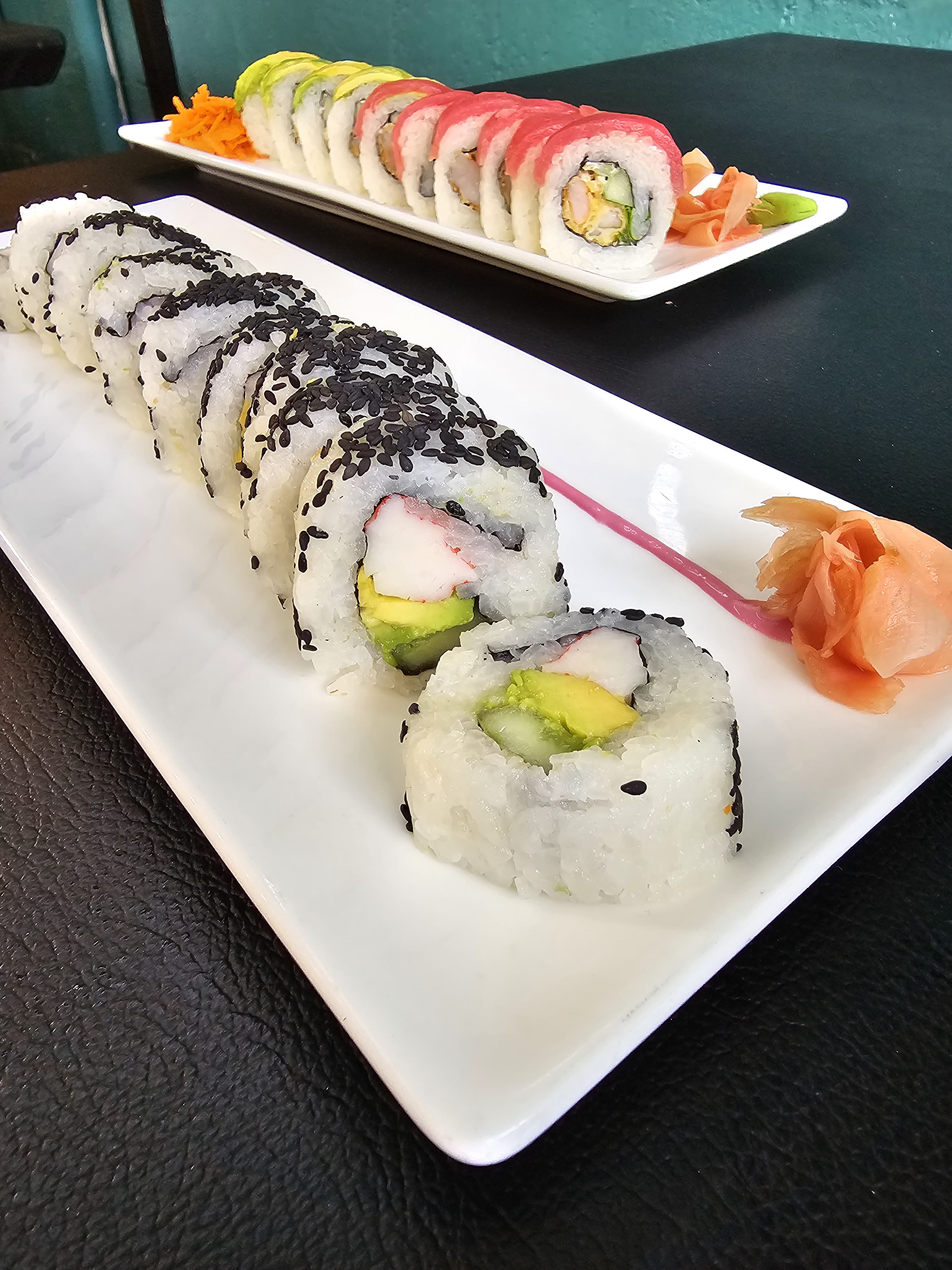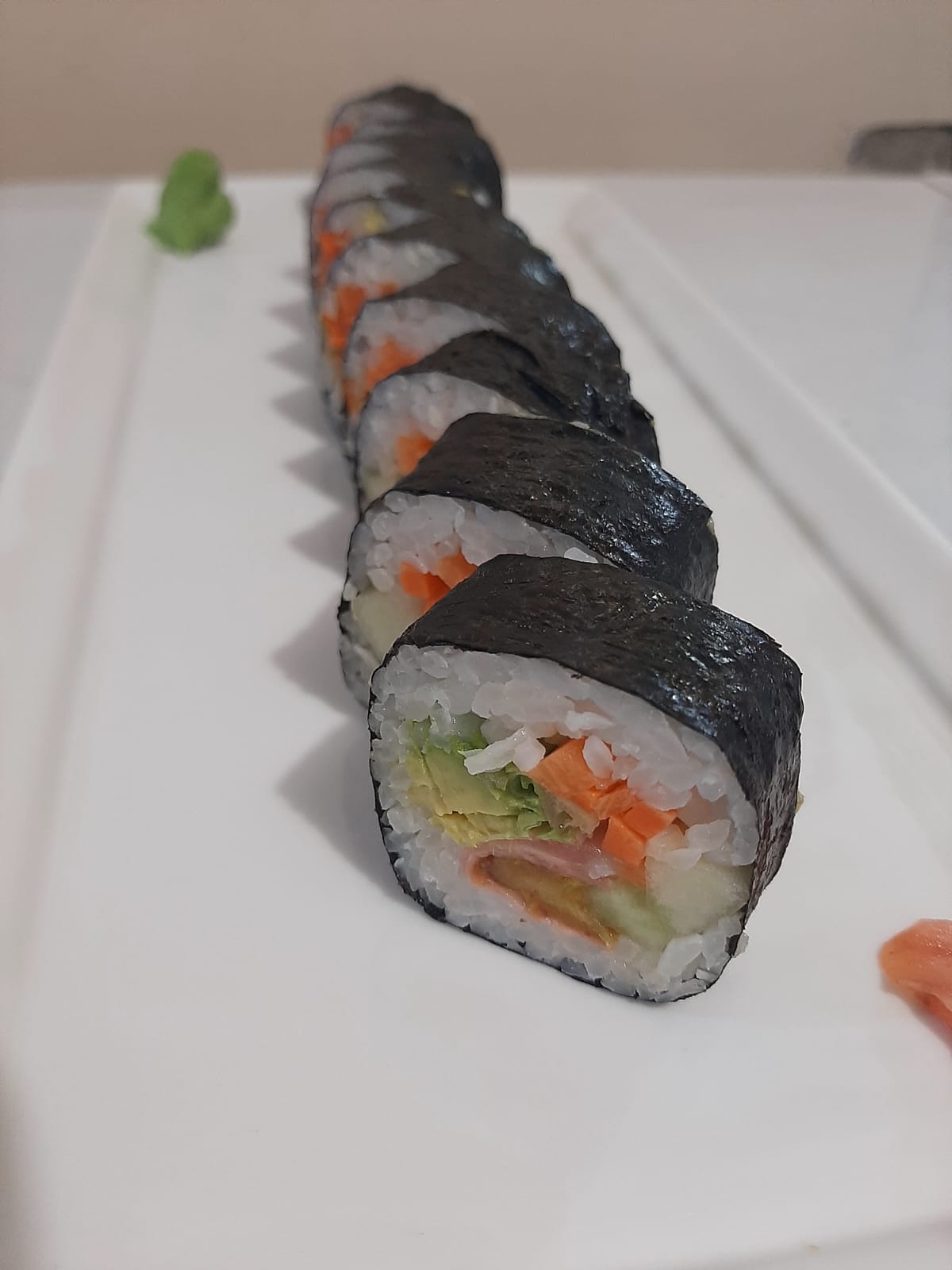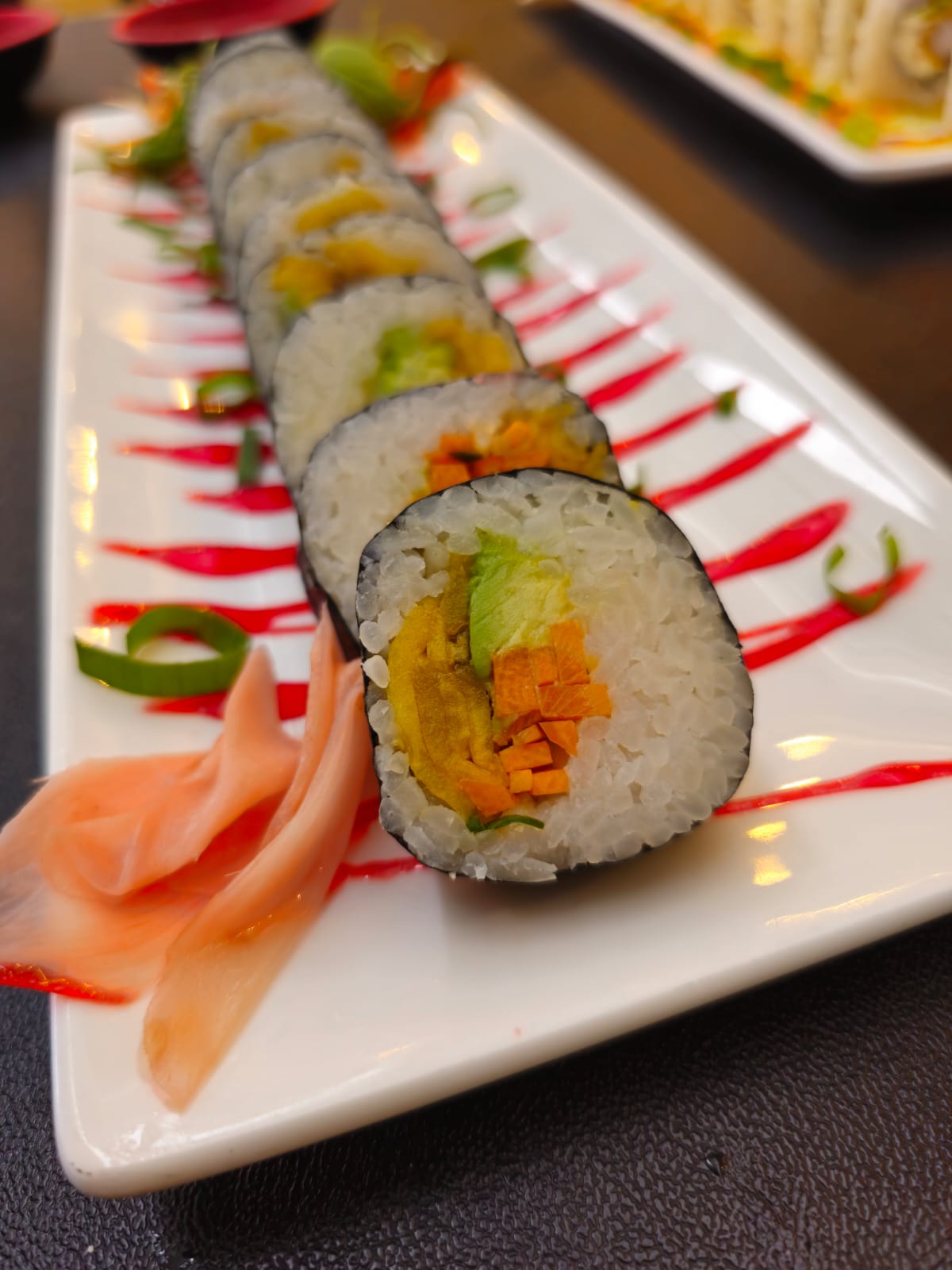 Delicioso sushi relleno de aguacate, plátano, lechuga, zanahoria, pepino, jengibre y alga por fuera.