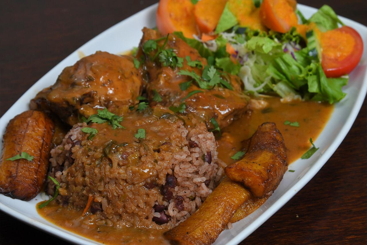 Arroz, frijoles, maduro,ensalada verde