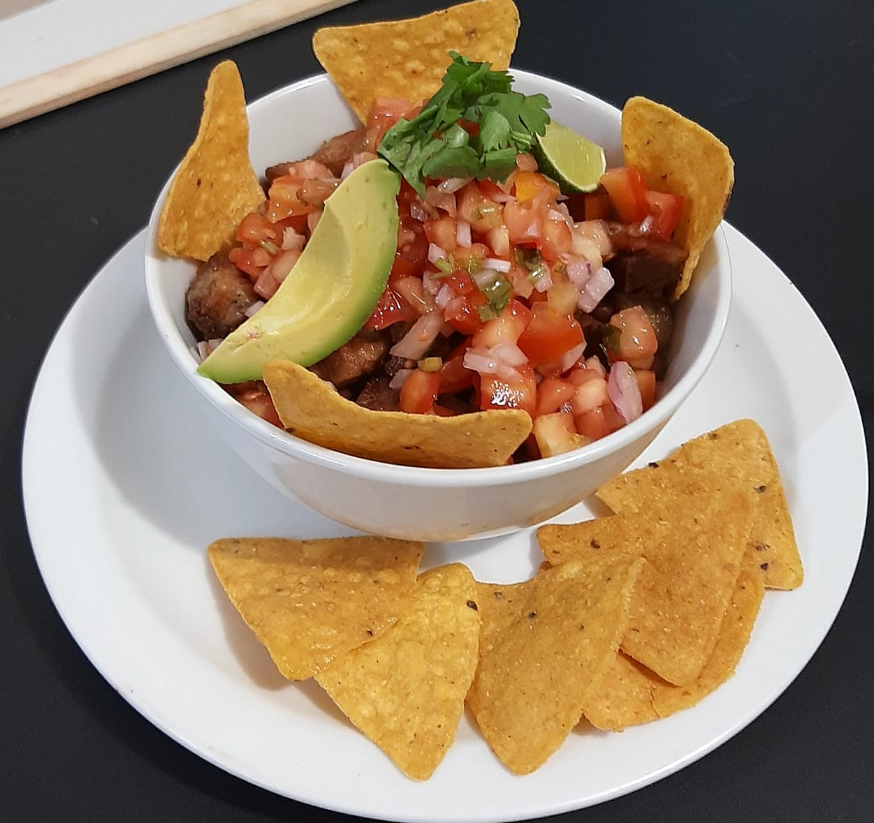 Delicioso Plato con arroz, frijoles, pico de gallo, chicharron, aguacate y picos tostados