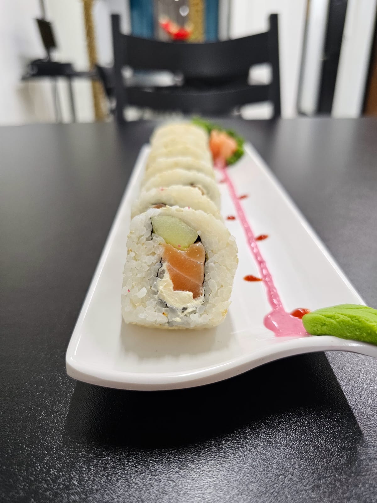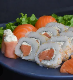 Delicioso sushi relleno de salmón, queso crema, aguacate, surimi, alga por fuera y salsa de anguila.