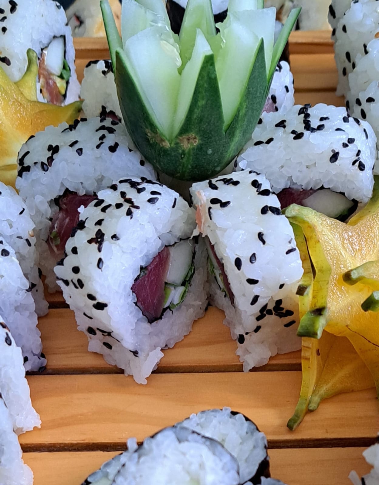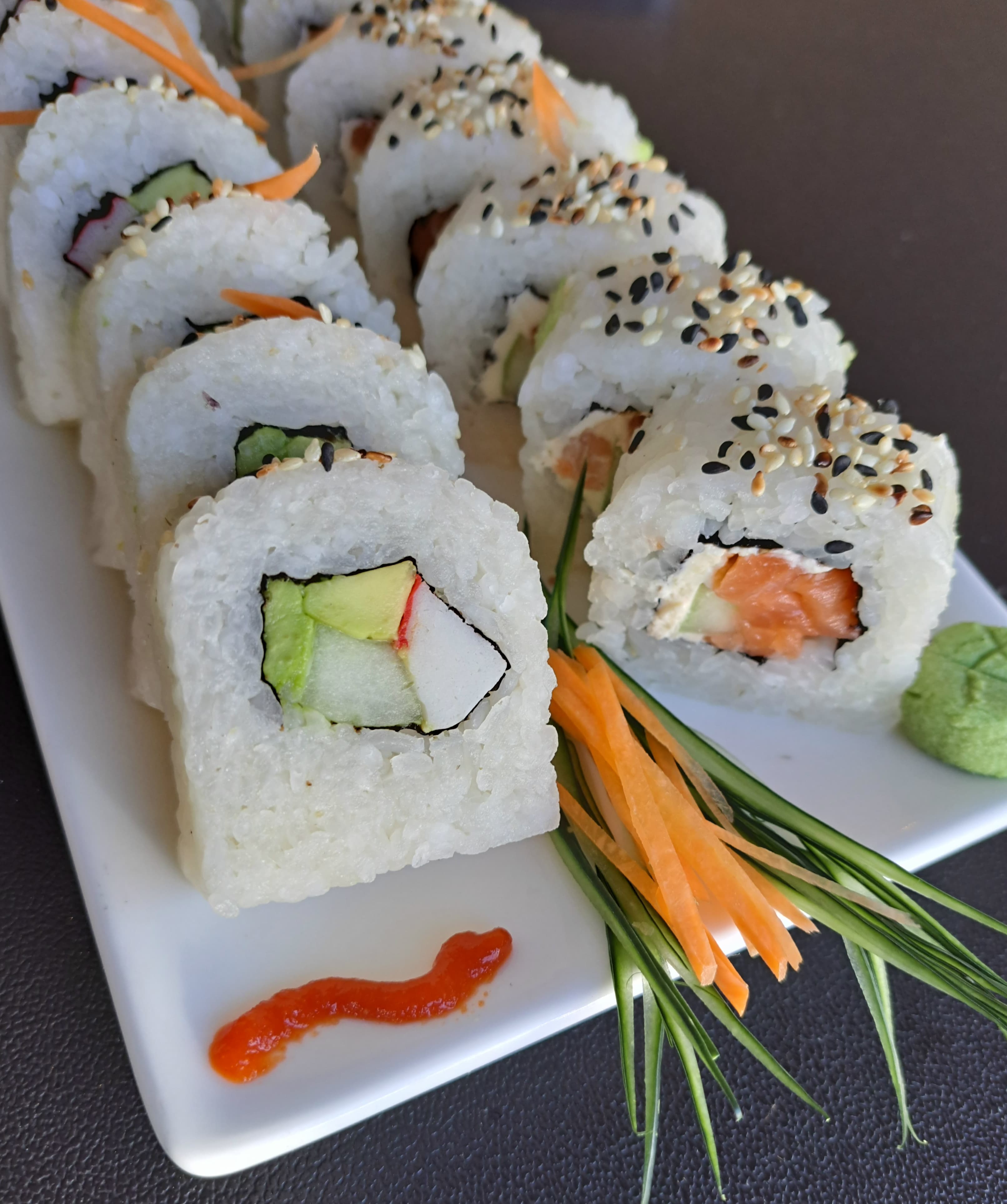 Delicioso sushi relleno de aguacate, surimi, pepino, cubierto de ajonjolí.
