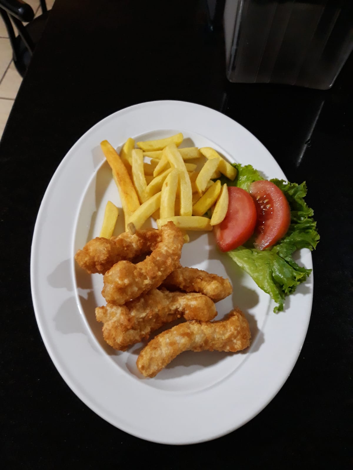 Saborosos dedos de pescado empanizado acompañado de papas fritas y decorado de lechuga con tomate