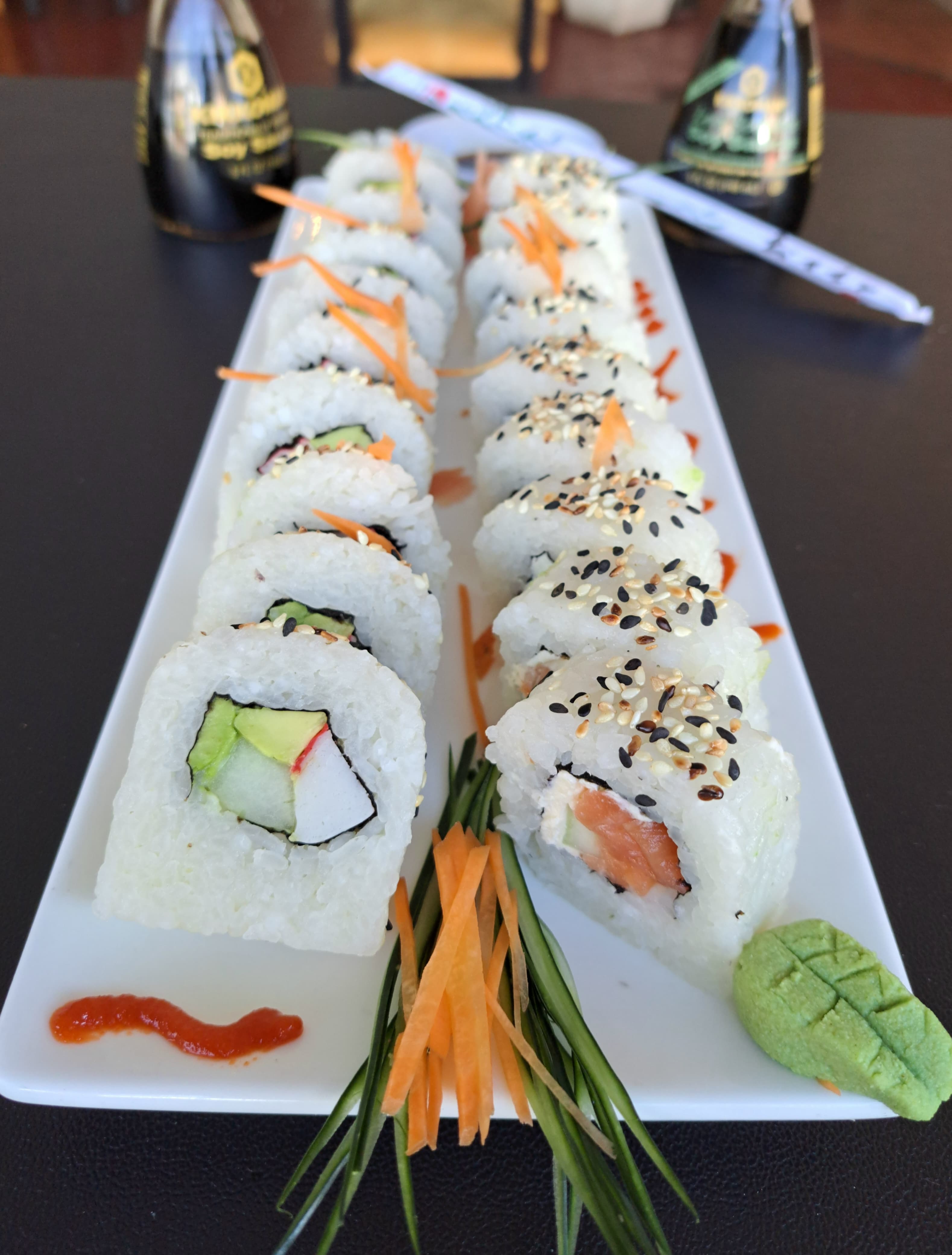 Deliciosos sushi de 10 piezas de rainbow, 10 piezas de kappa maki roll, 5 piezas de niguri surtido, 5 piezas de sashimi surtido.
