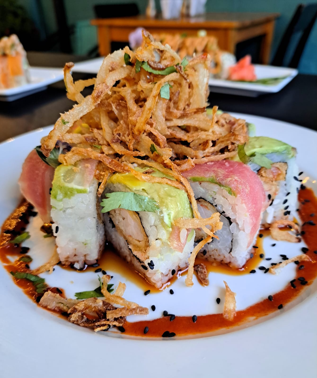 Delicioso sushi relleno de camarón y mezcla dinamita, cubierto de aguacate, limón, atún, cebolla crispy, shiracha y salsa de anguila.