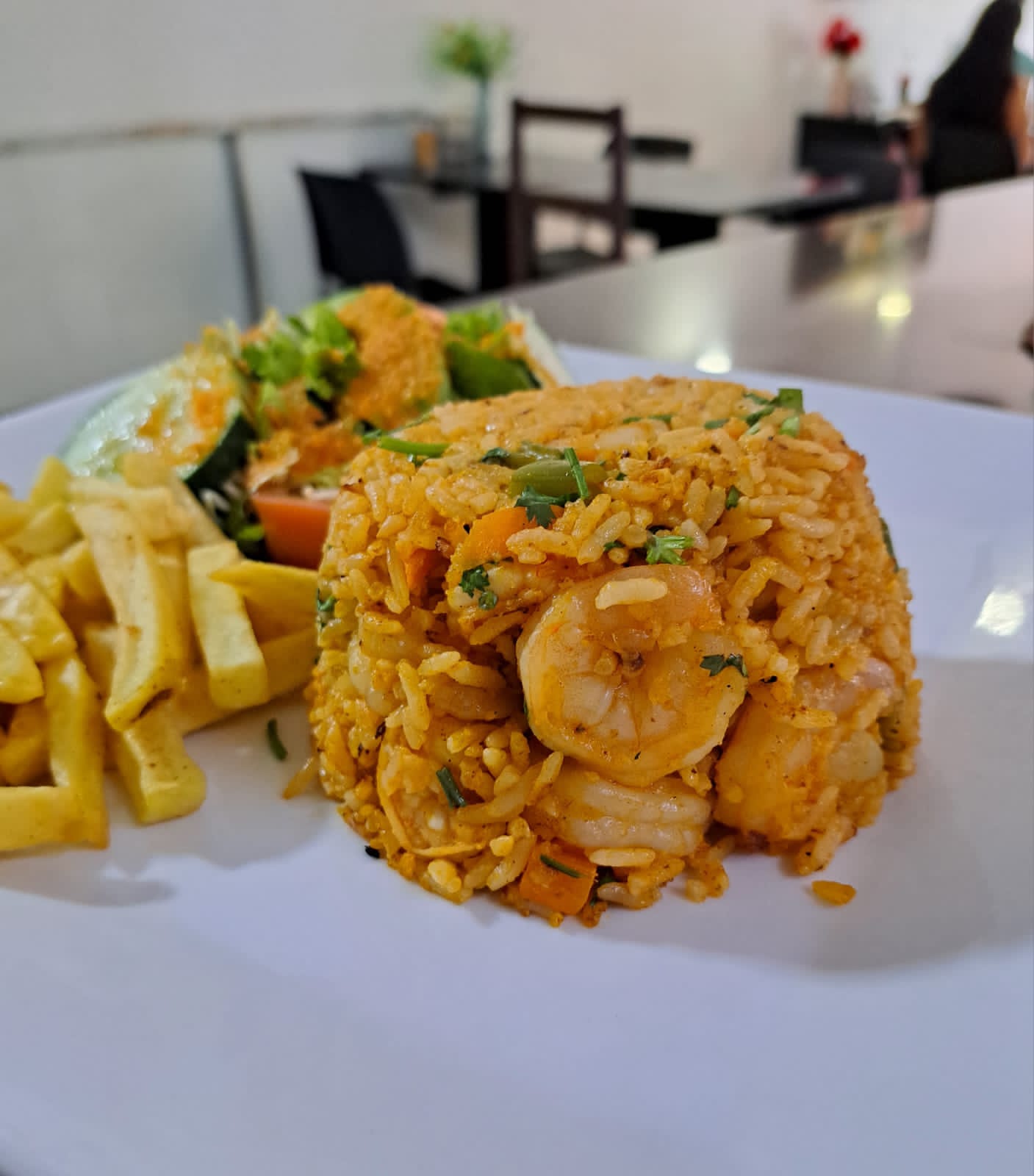 Delicioso arroz con camarones acompañado de papas fritas más ensalada.