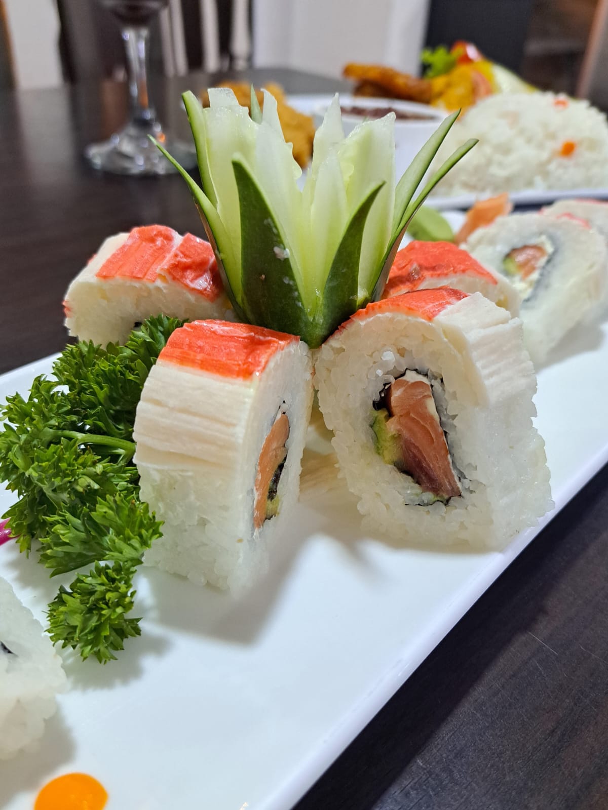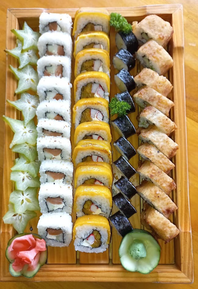 Deliciosos sushi de 10 piezas de shake roll, 10 piezas de kani tempura, 10 piezas de california roll, 10 piezas de tuna maki, 7 piezas de niguiri surtido, 8 piezas de sashimi surtido.