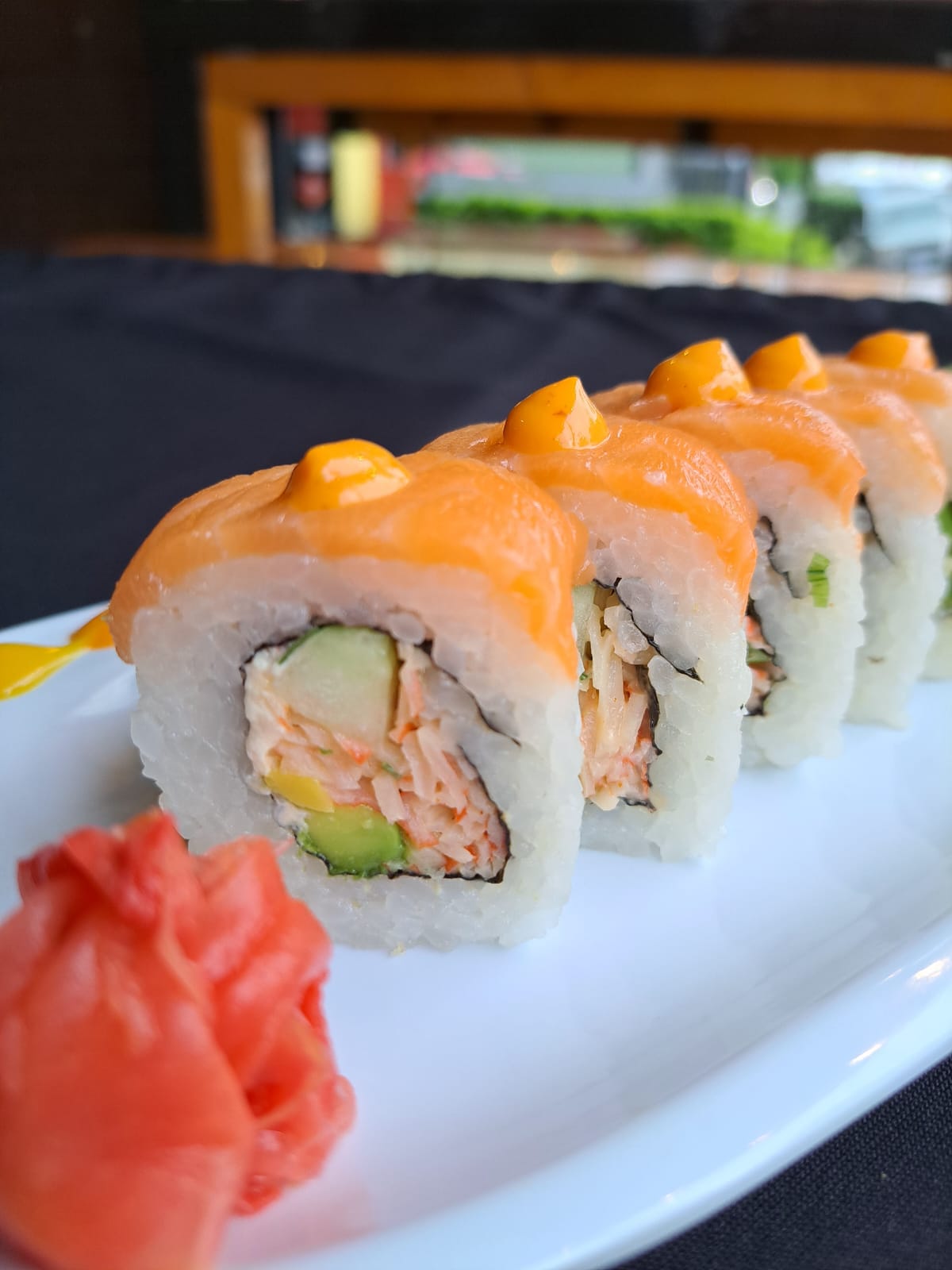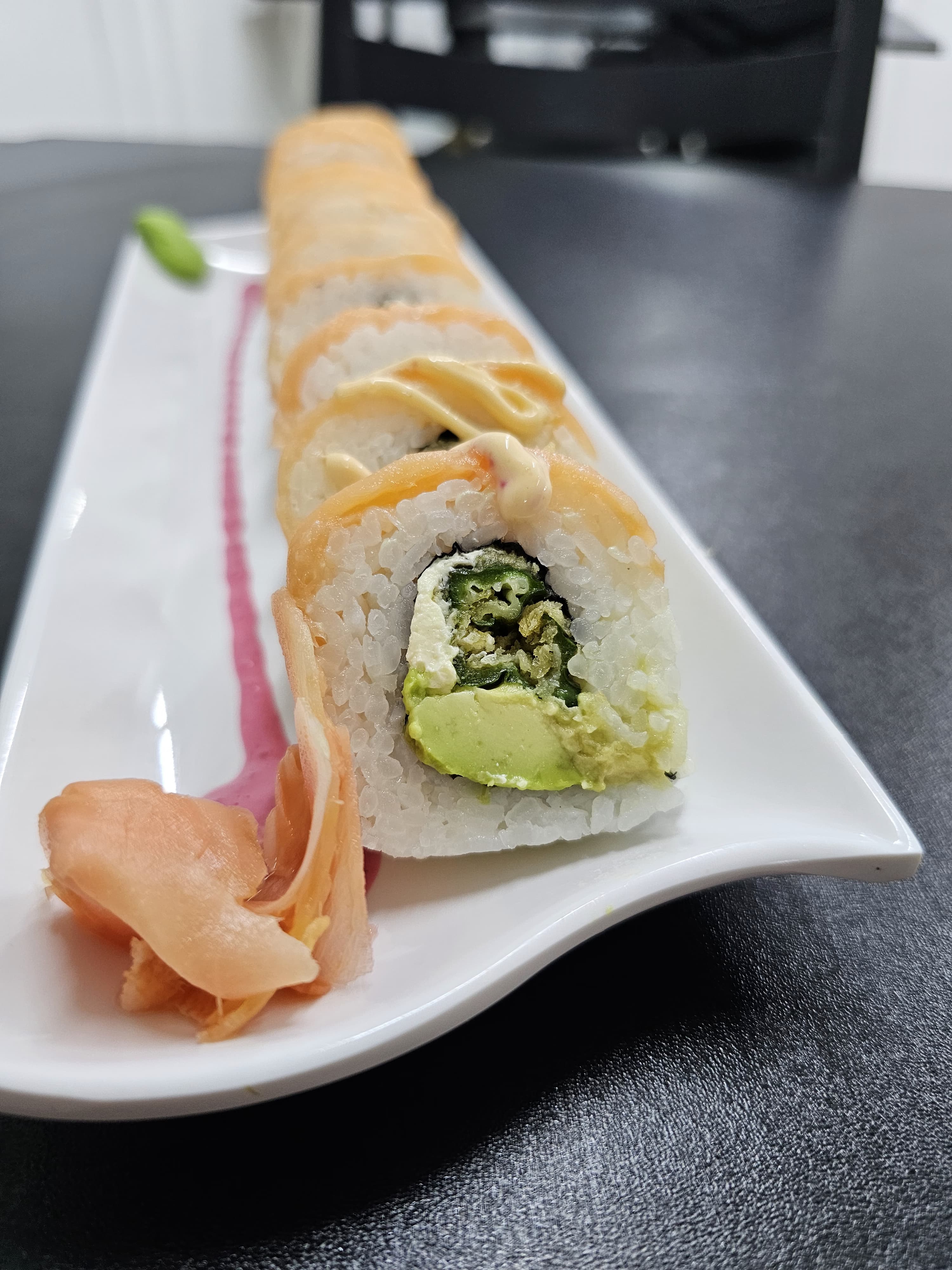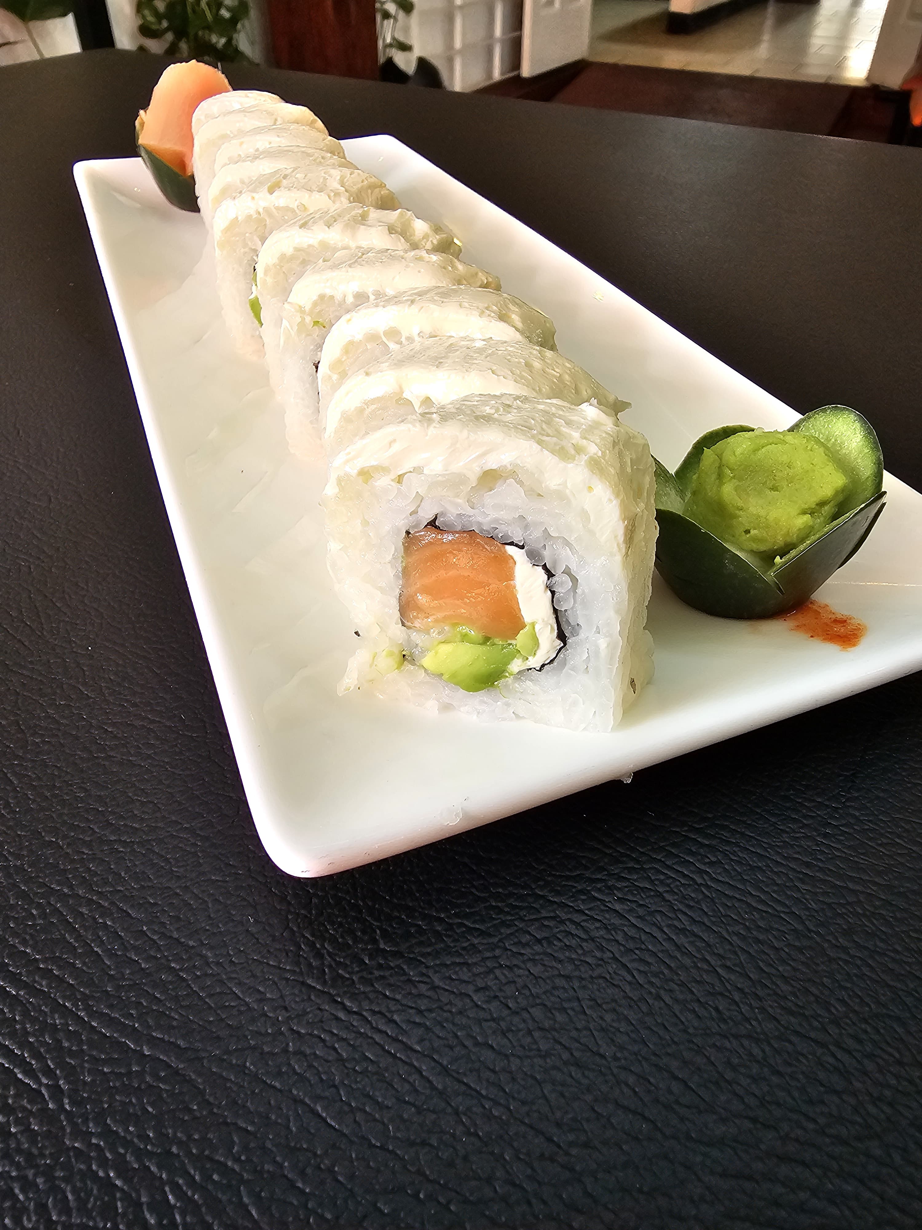Delicioso sushi relleno de jalapeño empanizado con queso crema, aguacate, cubierto de salmón y mayonesa.