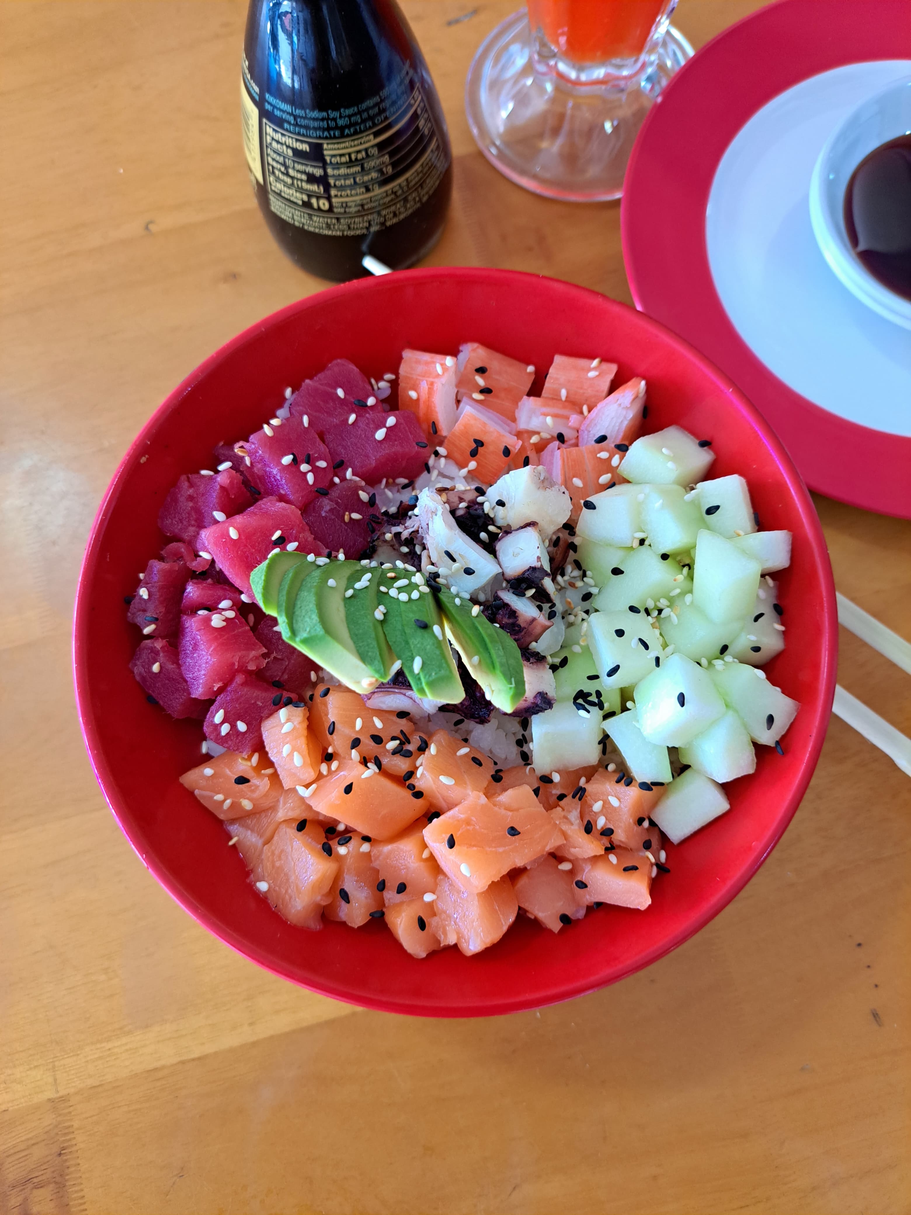 Delicioso bowl acompañado de base de arroz, atún, salmón, kanikama, pulpo, aguacate y pepino.