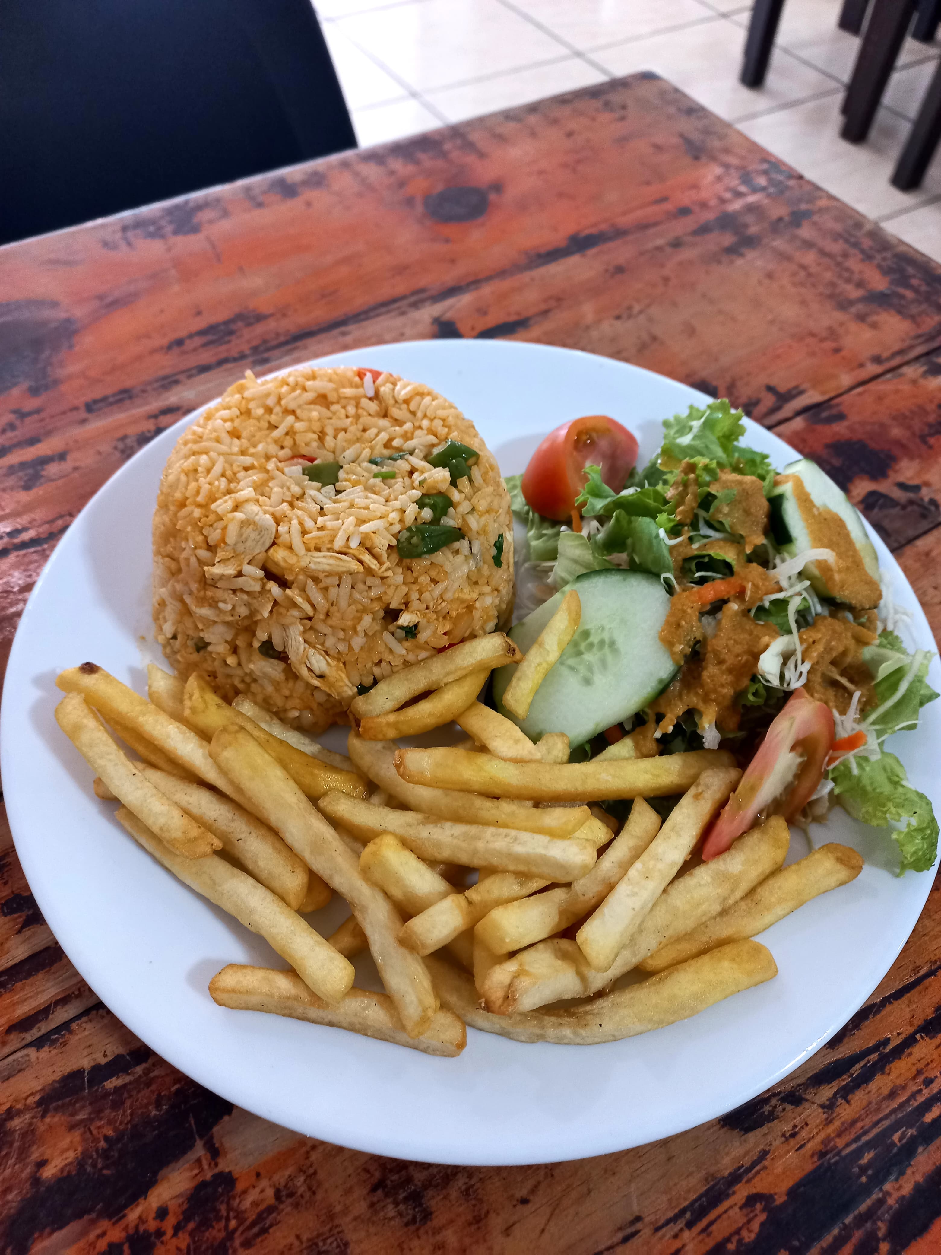 Delicioso arroz con pollo acompañado de papas fritas más ensalada.
