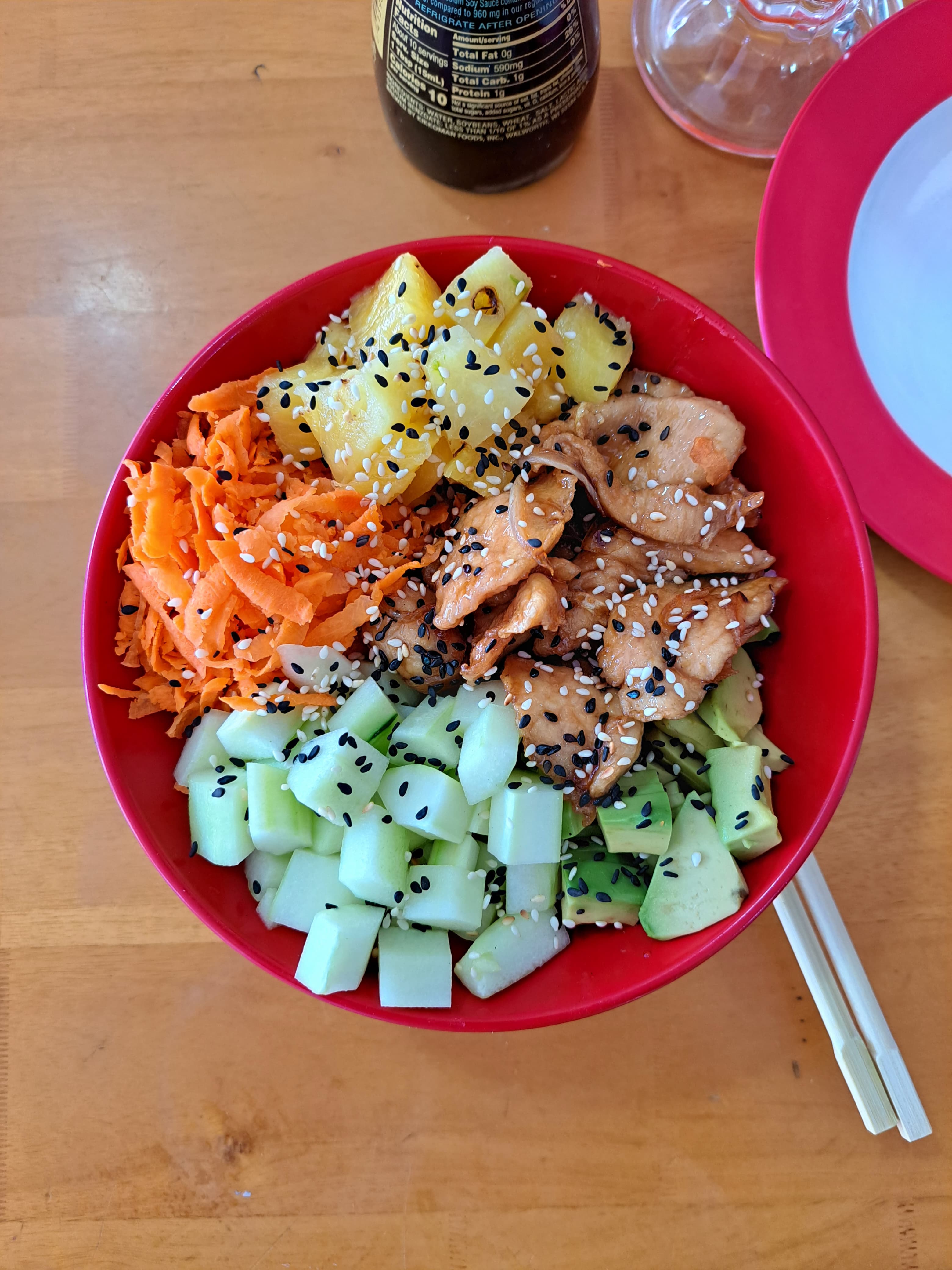 Delicioso bowl acompañado de base de arroz, teriyaki, aguacate, zanahoria, pepino, piña y proteína a escoger.