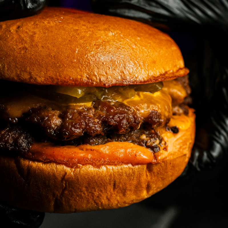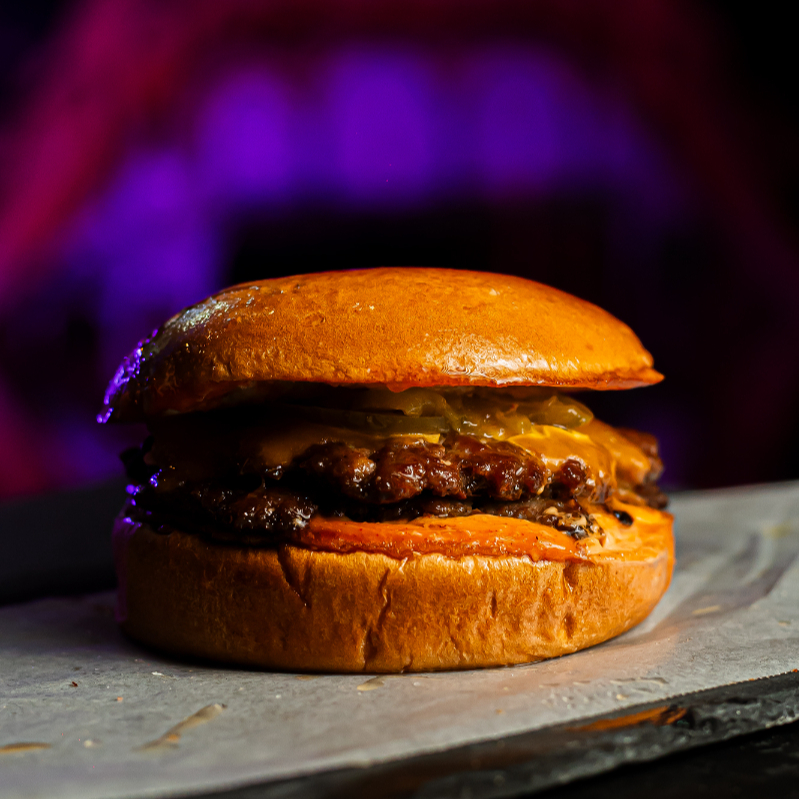 Dos tortas de carne, queso americano, salsa de la casa y pepinillos.