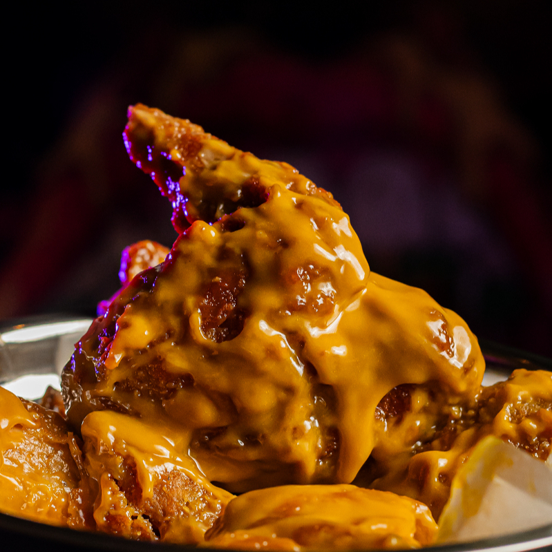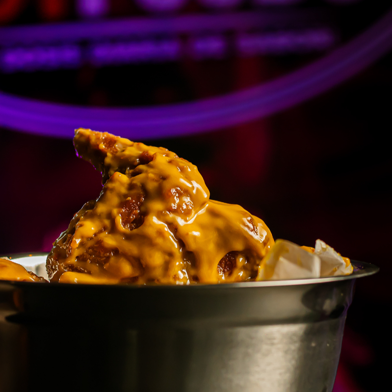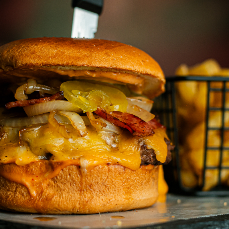 Hamburguesa de carne premium, cebolla caramelizada, queso mozzarella, queso americano, tocino en trozos, pepinillos, salsa especial de la casa y papas fritas.