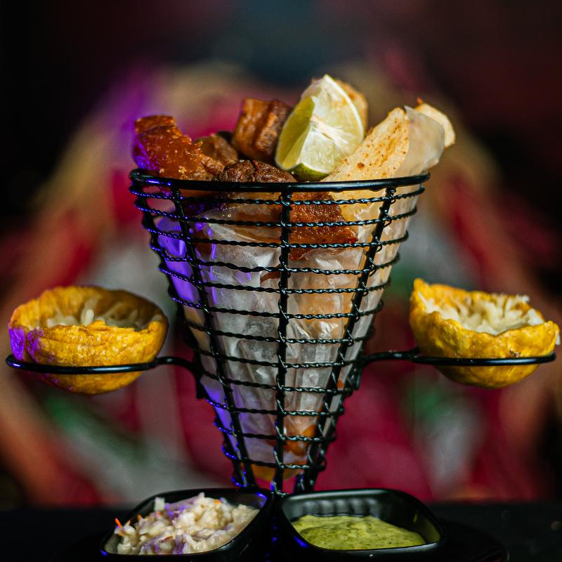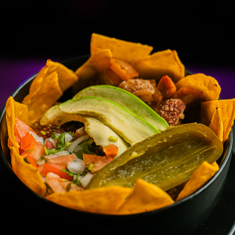 Tazón de chifrijo con chicharrón de carne, chicharrón de concha y chips.