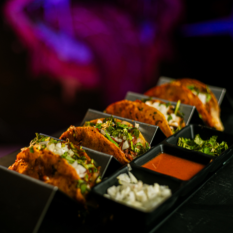 Deliciosos 4 tacos de birria acompañados con salsa, cebolla y culantro.