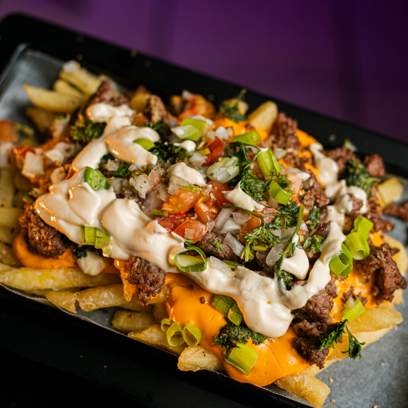 Papas fritas, queso nacho, carne molida, natilla, tomate, cebollino y perejil.