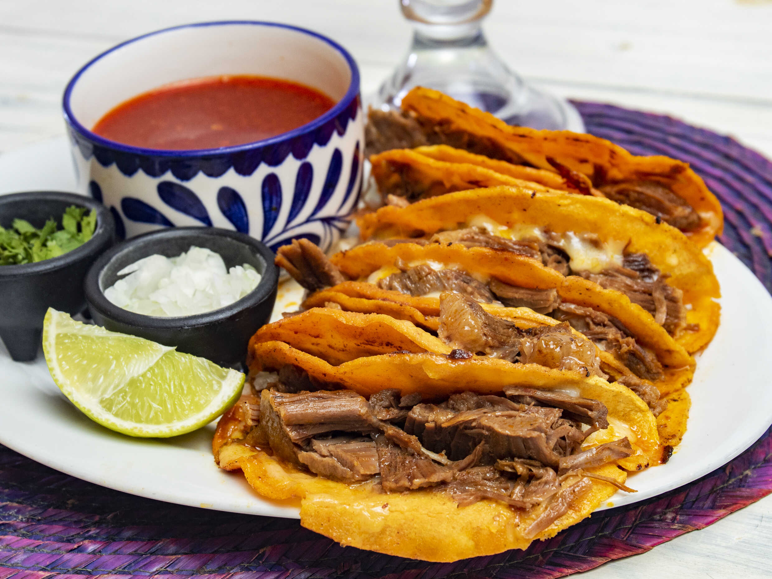 Incluye tortillas, cebolla morada, cilantro y todas nuestras salsas.