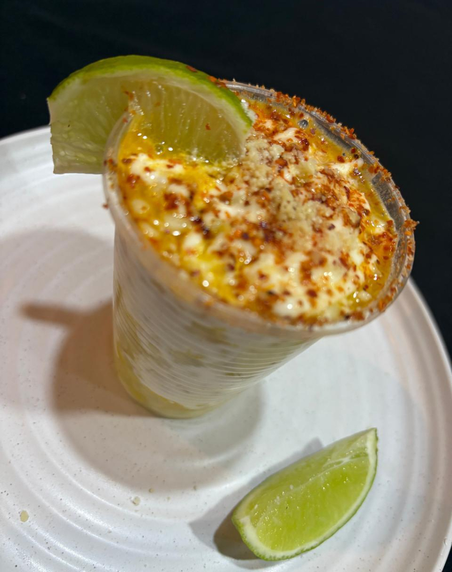 Vaso de granos de maíz tierno cocidos en caldo con epazote y mantequilla.