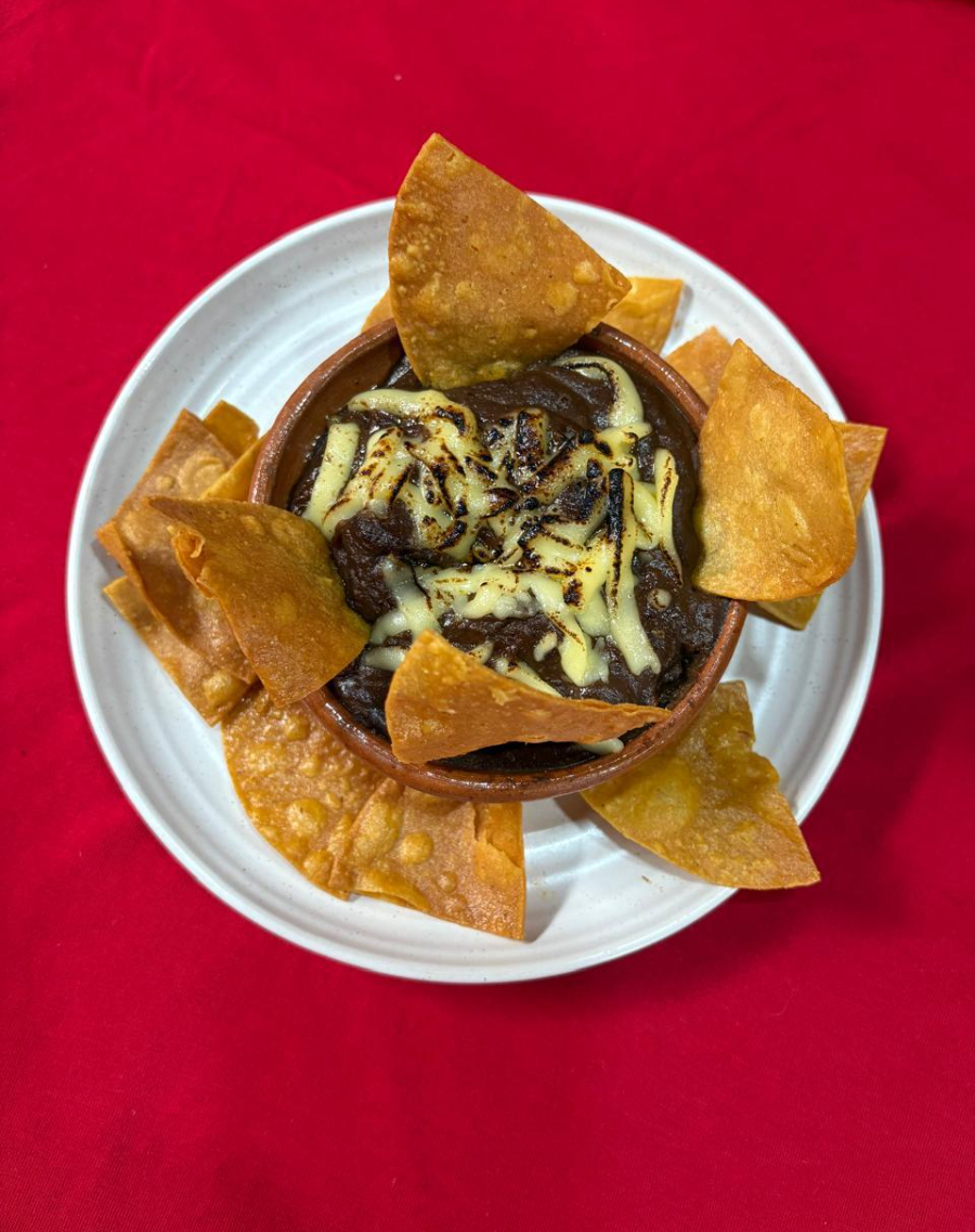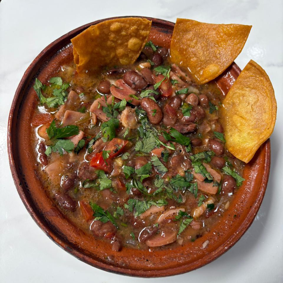 Porción pequeña de frijoles cocidos en caldo con tocino, chorizo, jitomate y cebolla.